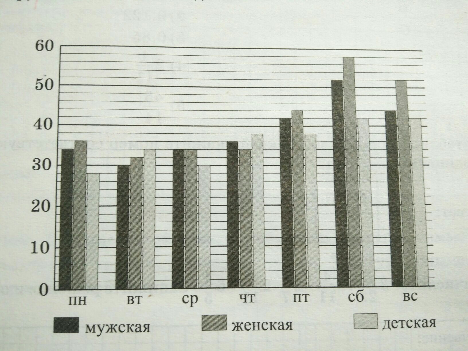 В обувном магазине Лапти три отдела: мудской, женский и детской обуви. На диаграмме представлены данные о выручке в тысячах рублей за неделю по отделам.
