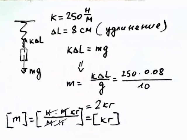 Срочно , дам 50 баллов !!!!!!!!!!На динамометр подвешен груз некоторой массы. Динамометр снабжен пружиной жесткостью 250 Н/м . При определении веса было установлено, что пружина удлинилась на 8 см . Определи массу груза. Коэффициент g=10 Н/кг