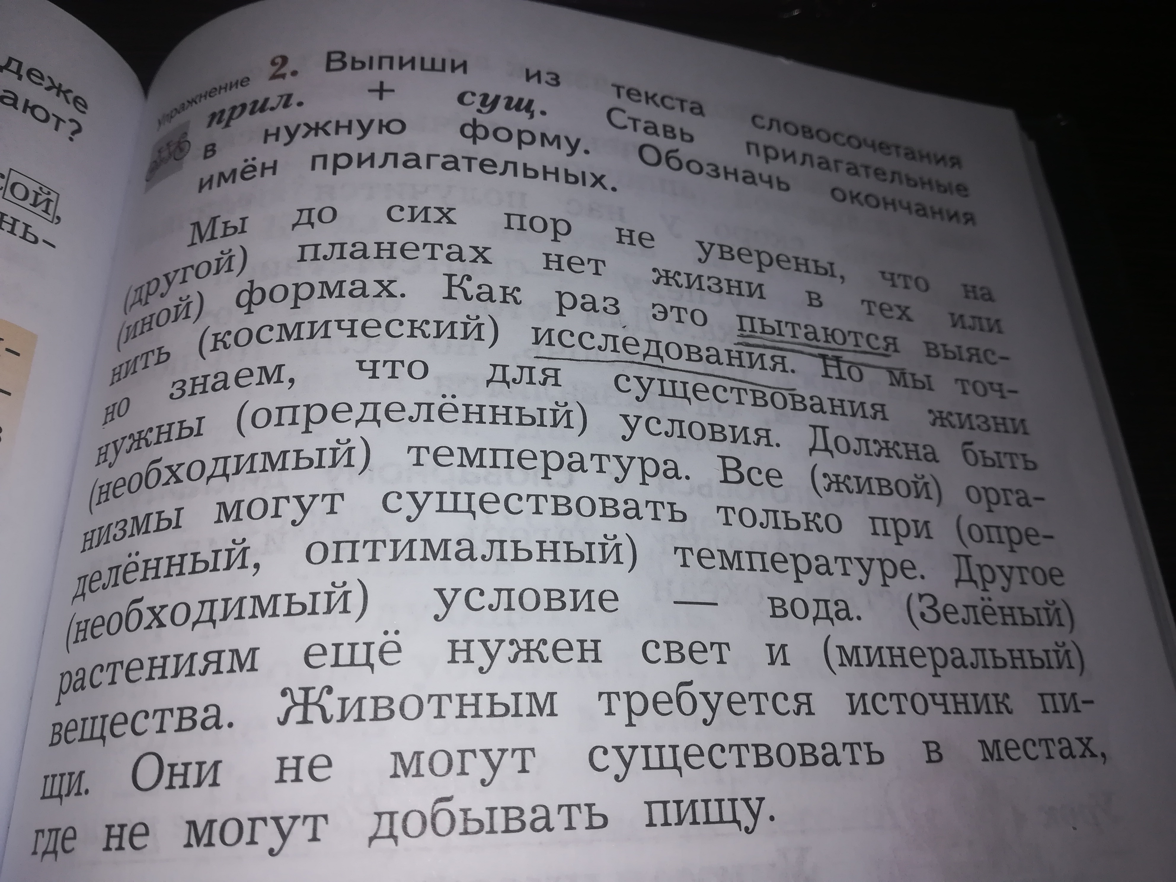 Мы до сих пор не уверены, что на других (предложный) планетах нет жизни в тех или иных (предложный) формах. Как раз это пытаются выяснить космические (родительный) исследования. Но мы точно знаем, что для существование жизни нужны определенные (именительный) условия. Должна быть необходимая (именительный) температура. Все живые (именительный) организмы могут существовать только при определённой (предложный), оптимальной (предложный) температуре. Другое необходимое (именительный) условие - вода. Зеленым (дательный) растениям еще нужен свет и минеральные (именительный) вещества. Животным требуется источник пищи. Они не могут существовать в местах, где не могут добывать пищу.