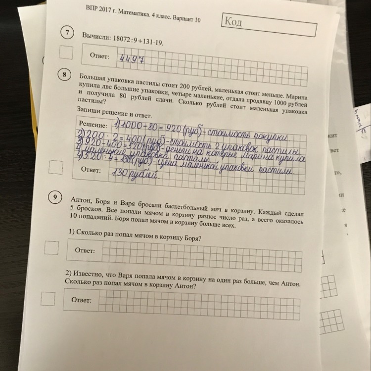 Боря:5 раз попал, Варя:3 раза попала, Антон:2 раза попал