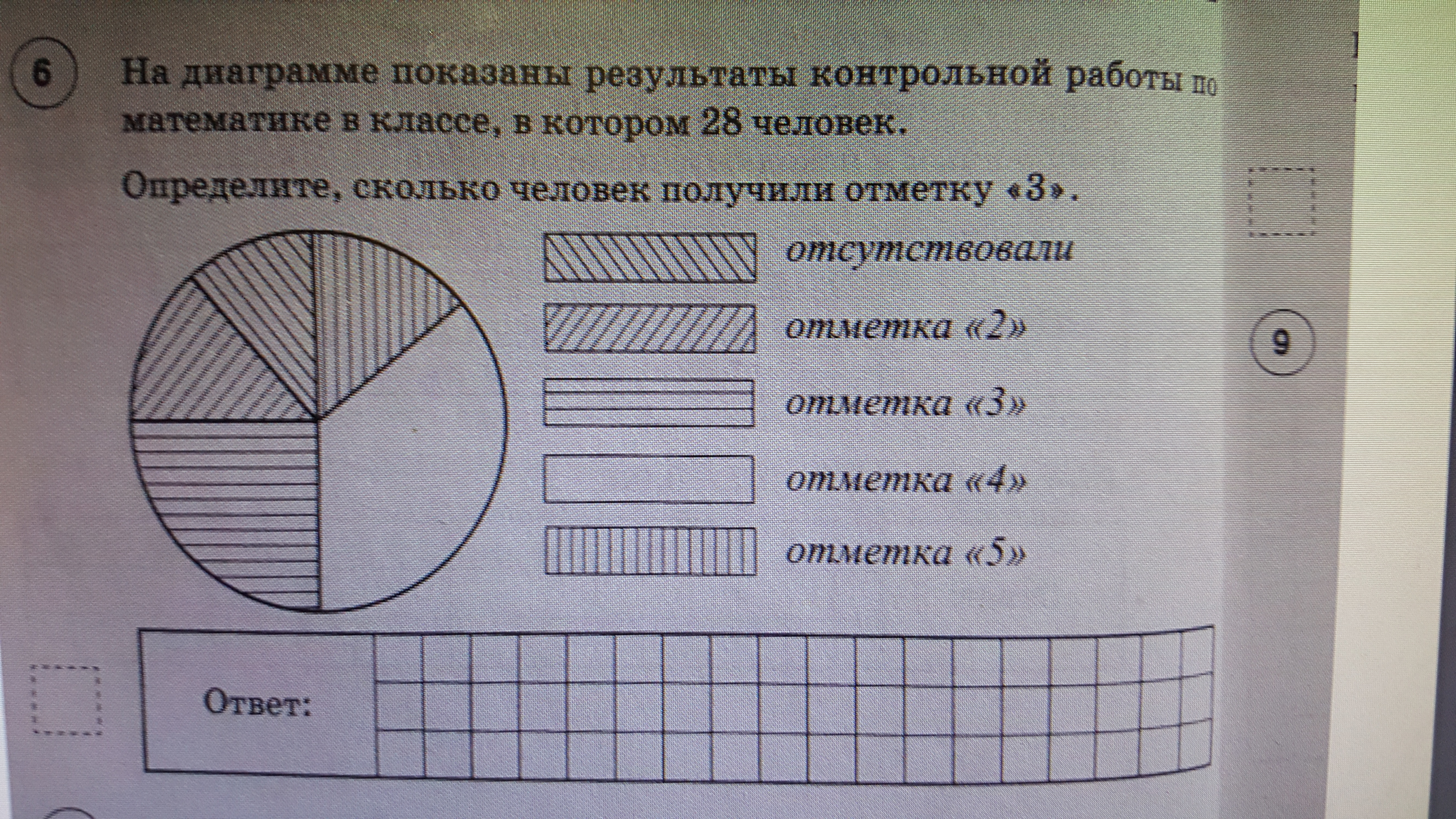 Закрашена 1/4 круга с отметкой 3, значит 28:4=7 человек.