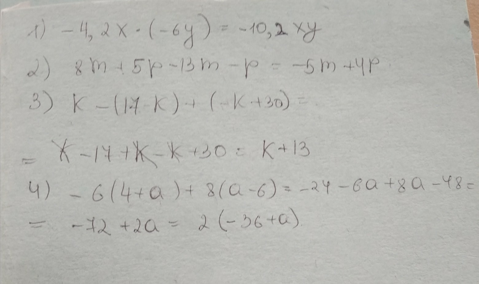 такс, значит....раскрываем скобки,..-6(4+а) -6•4=-24, -6•а= -6а == -24-6а.......вторая скобка : 8(а-6).... 8•а= 8а.... 8• (-6)= -48== 8а-48....получается полное выражение : -24-6а+8а-48.... -24-48= -72, а -6а+8а= 2а.....ну и можно просто поделить (-72а+2а) на 2,чтобы упростить,выносим 2 за скобку,и получаем 2(-36+а)... но последний шаг не обязательно.
