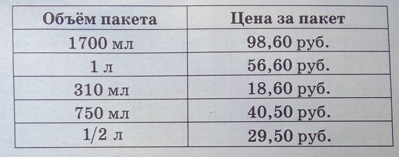 в магазине продается разное молоко (см. таблицу ).Какое молоко стоит дешевле всего за 1 литр вы? Запиши решение? в ответе укажите наименьшую цену за 1 литр