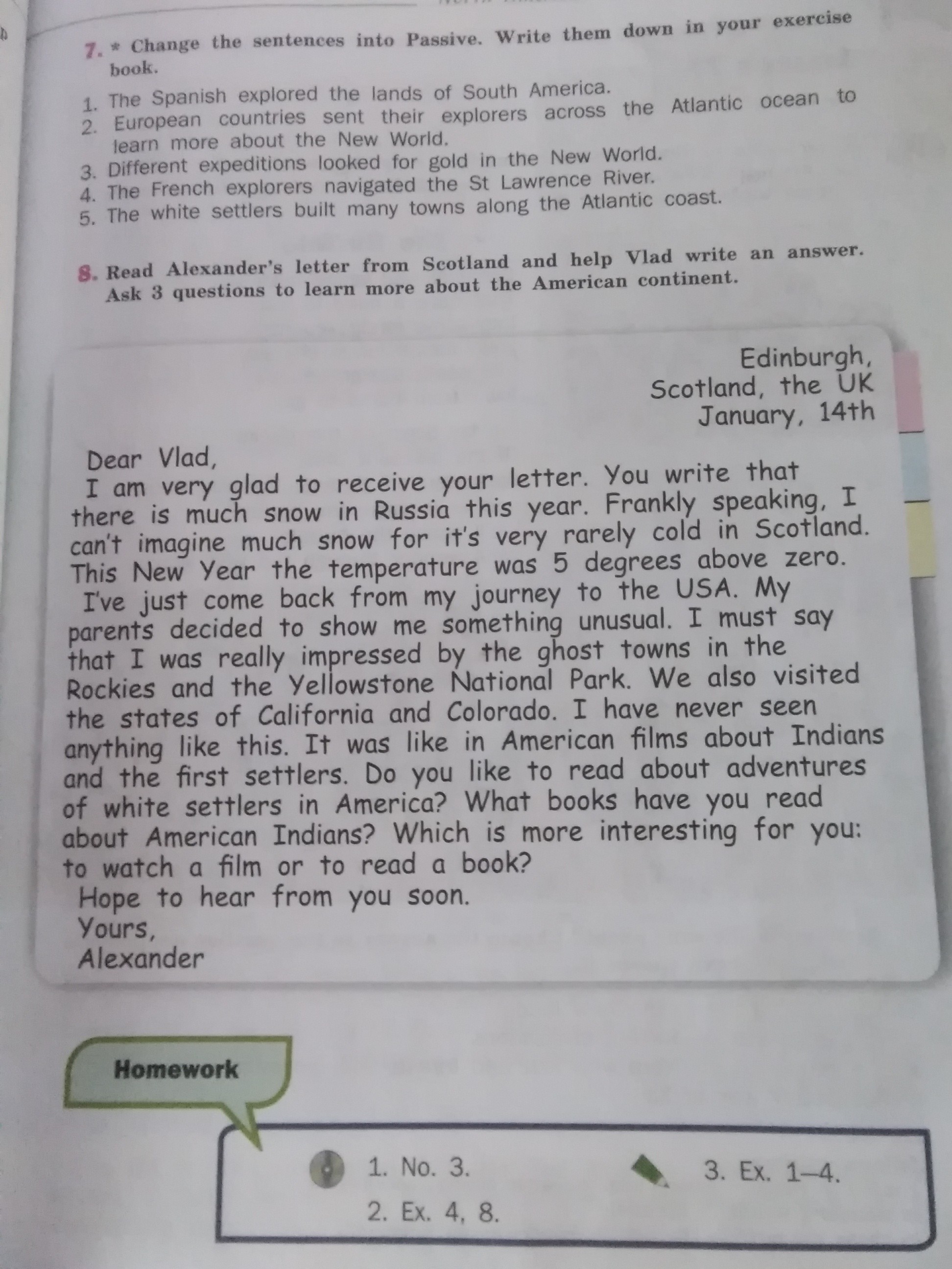 Дорогой Влад, вы пишете, что я очень рад получить ваше письмо, в этом году в России много снега. Честно говоря, я не могу себе представить, что в Шотландии очень редко бывает холодно. В этом году температура была на 5 градусов выше нуля, только что вернулась в США. Мои родители решили показать мне что-то необычное. Я должен сказать, что меня поразили города-призраки в Скалистых горах и национальный парк желтого цвета. Мы также посетили штаты Калифорния и Колорадо. Я никогда не видел, как это было в фильмах об индейцах и первых поселенцах. Вы любите читать о приключениях белых поселенцев в Америке? Какие книги вы читали об американских индейцах? Что более интересно для вас: смотреть фильм или читать книгу? Надеемся услышать от вас скоро.