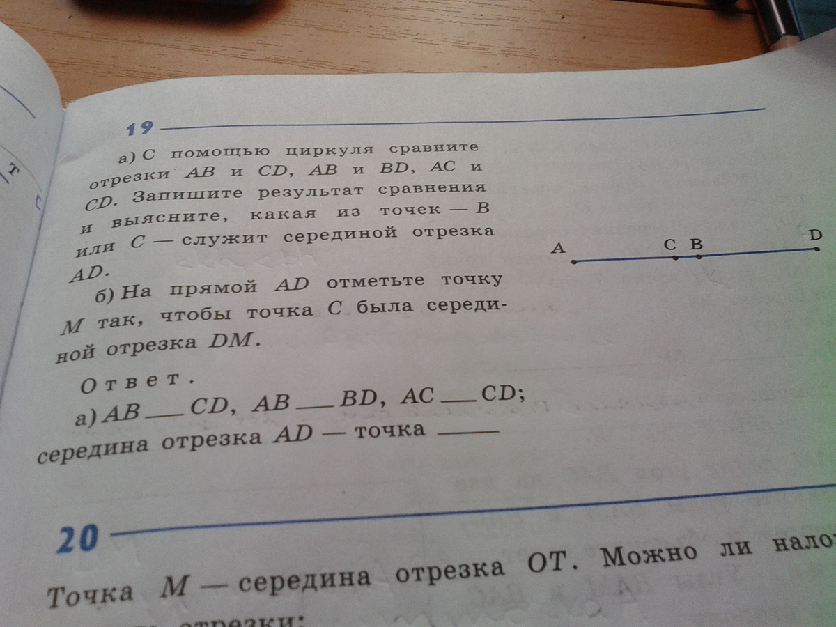 2). Берешь циркуль и радиусом, большим половины отрезка AD делаешь засечки из точек A и D с обоих сторон отрезка AD. Точки пересечения дуг соединяешь. Это будет серединный перпендикуляр к AD и точка пересечения его с отрезком AD и будет его (AD) середина.