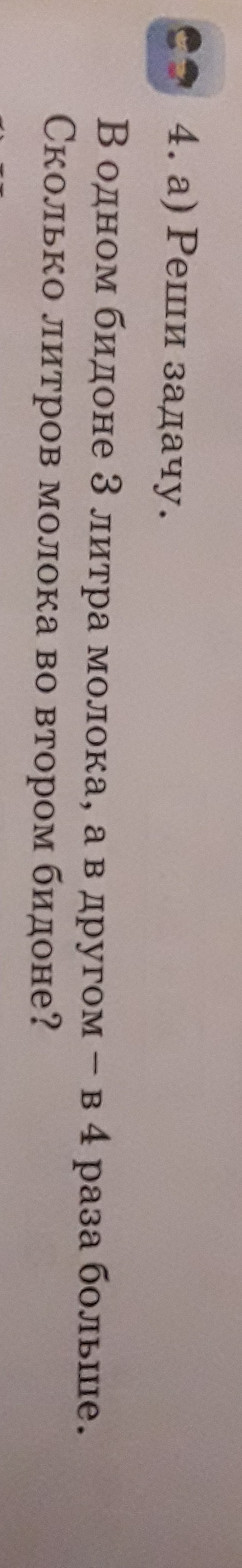В одном бидоне 3 литра молока, а в другом-в 4 раза больше. Сколько литров молока во втором бидоне?