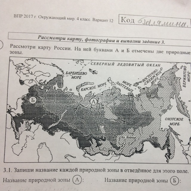 Рассмотри карту России. На ней буквами А и Б отмечены две природные зоны, запиши название каждой природной зоны