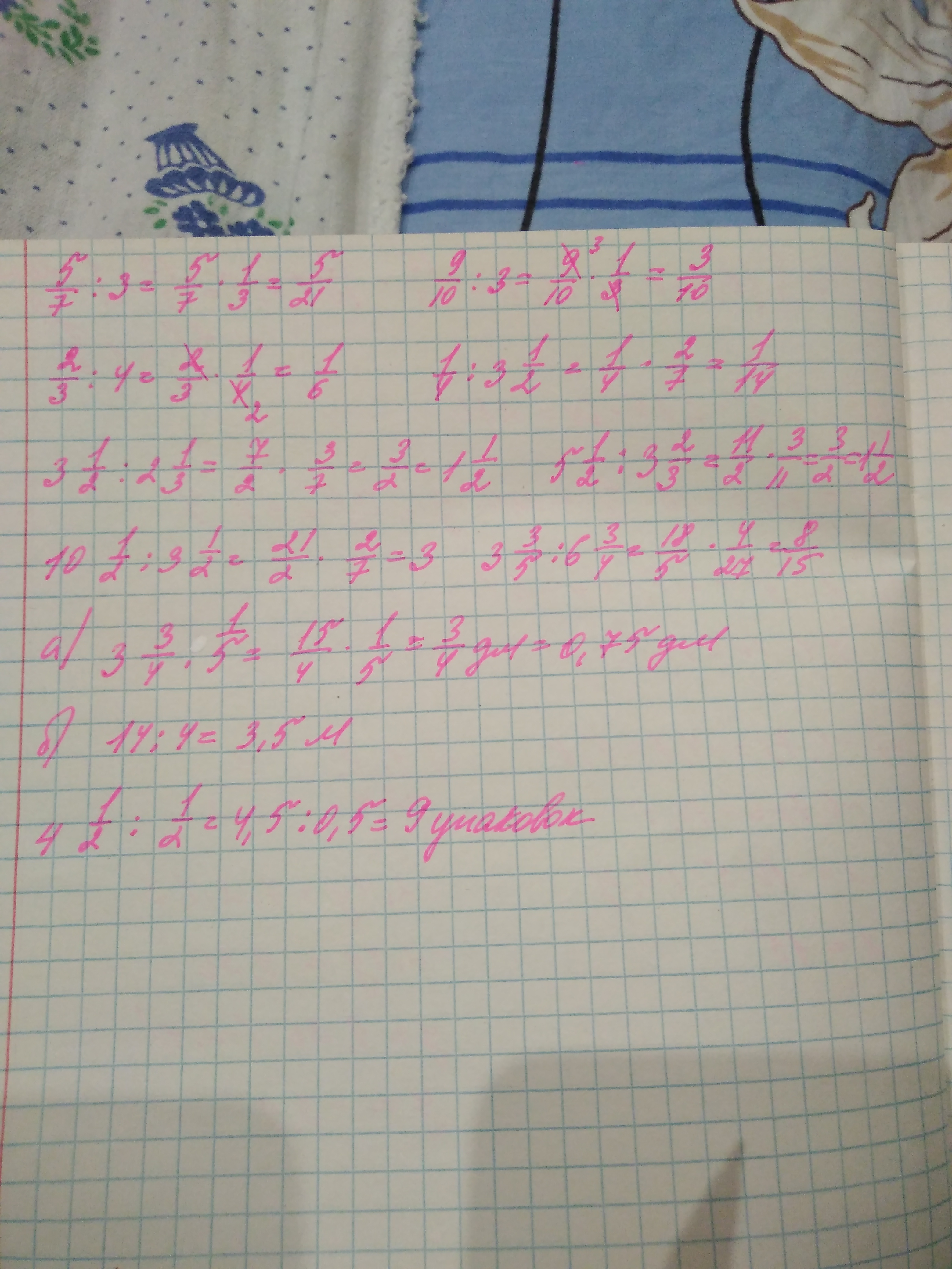 1/4 : 3 целых 1/2 ; 3 целых 1/2 : 2 целых 1/3 ; 10 целых 1/2 : 3 целых 1/2 ; 5 целых 1/2 : 3 целых 2/3 ; 3 целых 3/5 : 6 целых 3/4