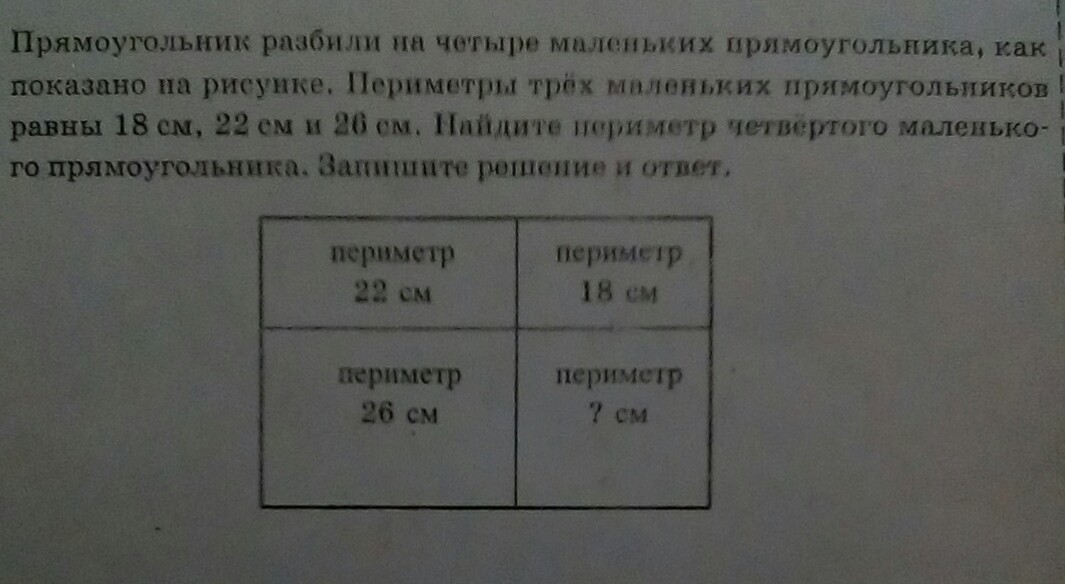 Прямоугольник разбили на четыре маленьких прямоугольника, как показано на рисунке. Примеры трёх маленьких прямоугольников равны 18 см, 22 см и 26 см. Найдите периметр четвёртого маленького прямоугольника. Запишите решение и ответ.
