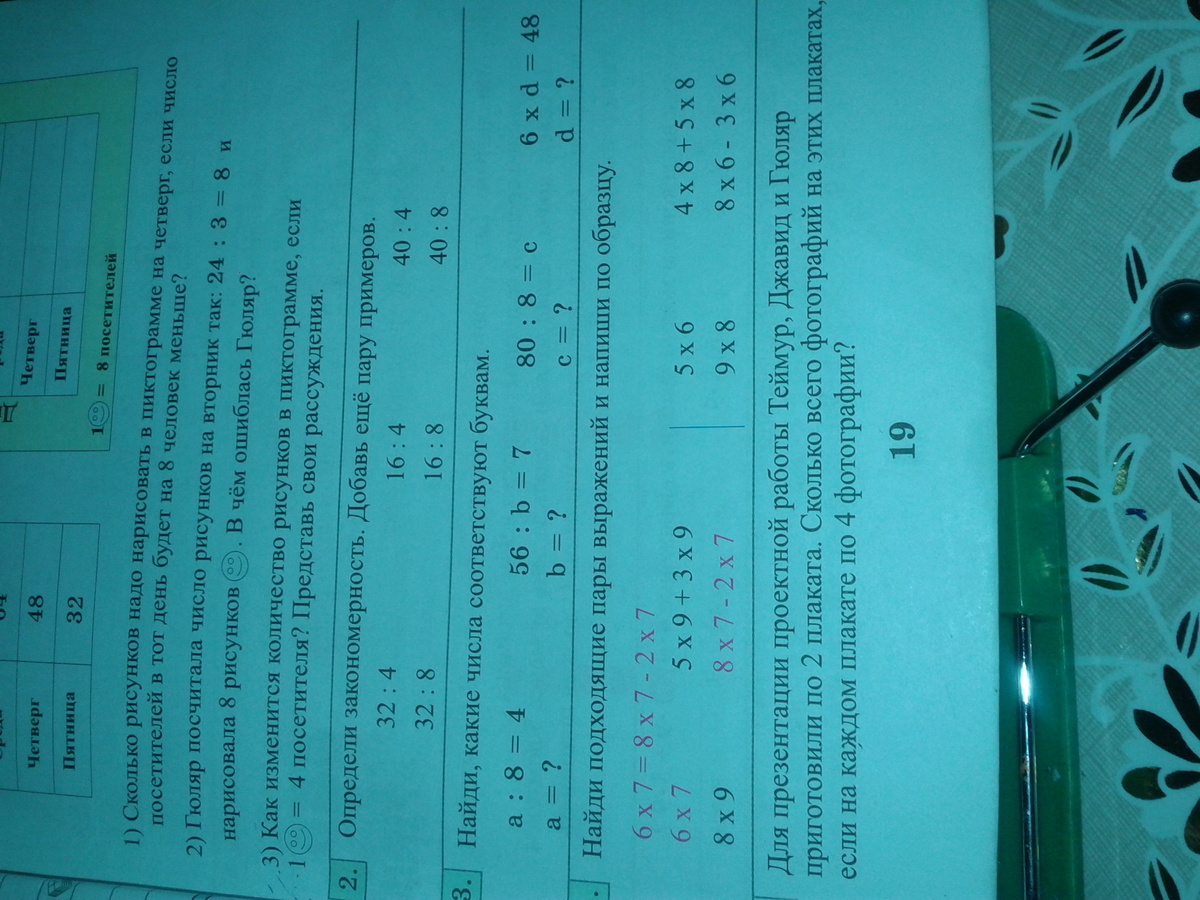 3 человека приготовили по 2 плаката. всего 3*2=6 плакатов.