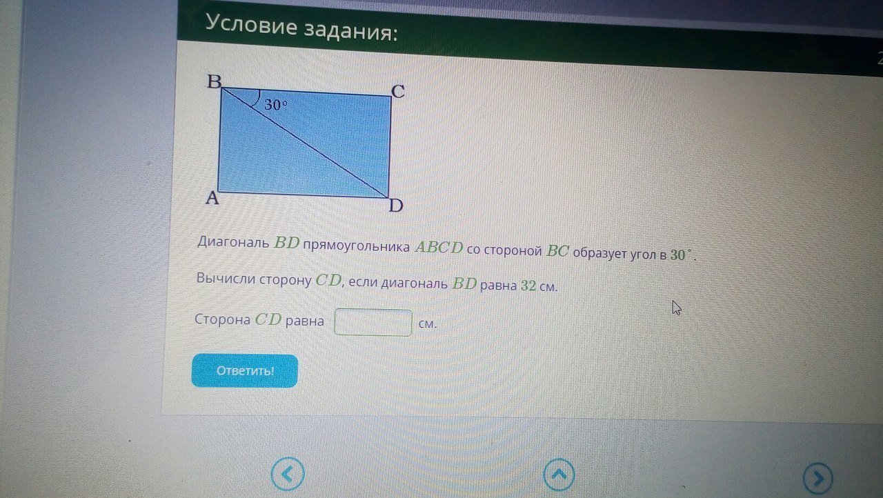 диагональ BD образует прямоугольный треугольник BCD, по теореме (сторона противолежащая углу 30° равна половине гипотенузе), имеем, что CD=32:2=16