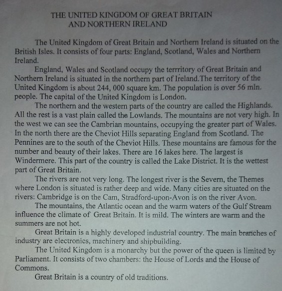 Соединенное Королевство Великобритании и Северной Ирландии расположено на Британских островах. Оно состоит из четырех частей: Англия, Уэльс, Шотландия и Северная Ирландия.Англия, Уэльс и Шотландия занимают территорию Великобритании и Северной Ирландии расположенную в северной части Ирландии.Площадь Соединенного Королевства около 244000 квадратных километров. Население составляет больше 56 миллионов человек. Столица Соединенного Королевства - Лондон.Поверхность Соединенного Королевства сильно отличается. Северная и западная части страны горные и называются Нагорье (?). Все остальное это обширная равнина, которая называется Низменностью (?). Горы не очень высокие. Реки не очень длинные. Наиболее важные это Северн и Темза. В горной части страны находится много красивых озер.Горы, Атлантический океан и теплые воды Гольфстрима влияют на климат Великобритании. Он умеренный круглый год (?). Зимой не так холодно, летом не так жарко.Великобритания высокоразвитая индустриальная страна. Она известна, как один из крупнейших производителей и экспортеров железных и стальных продукций, машинного оборудования и электроники, химических продуктов и текстиля. Одной из отраслей, является судостроение.Великобритания это страна со старыми культурными традициями и обычаями.Наиболее известные центры образования это Оксфордский и Кембриджский университеты. Они считаются интеллектуальными центрами Европы. Обучение здесь не бесплатное, оно очень дорогое.В Соединенном Королевстве монархия и Королева глава государства. Но управляется оно, правительством, возглавляемым премьер-министром. Британский парламент состоит из двух палата: Палата Лордов и Палата Общин.В Великобритании существует три основные политические партии: Трудовая партия, Консервативная партия и Либеральная партия.