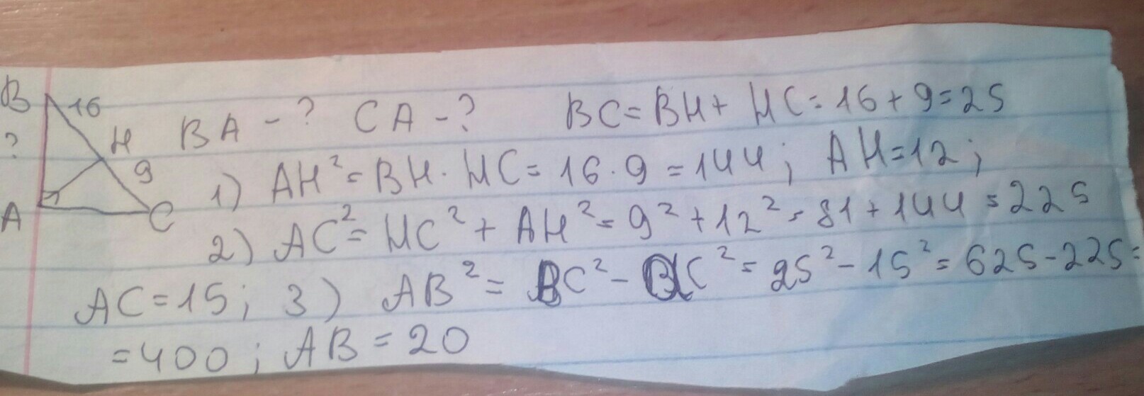 В треугольнике ABC угол А=90°. АН-высота, ВН=16, СН=9. Найдите катеты ВА и СА. Желательно с рисунком