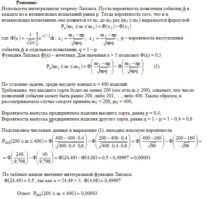 Предприятие выпускает 40% изделий высшего сорта. Какова вероятность того, что среди наудачу взятых 400 изделий - высшего сорта будет не менее 200?