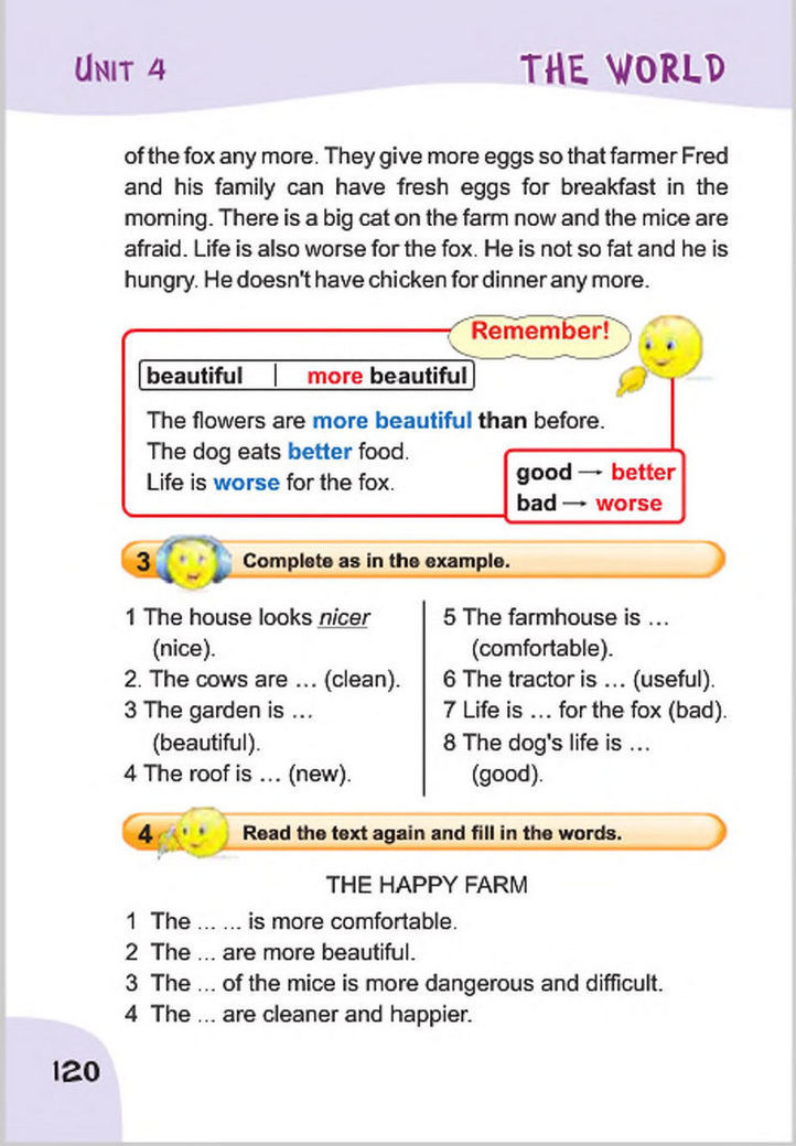 Ферма окрашена, и она выглядит лучше. Цветы красивее. Трактор более полезен. Фермер Фред управляет им и работает в полях. В огороде много овощей. Жена Фреда Лиза готовит их на ужин. Коровы чище. Они счастливее и дают много молока. Фред продает его, и он также делает сыр. Жизнь собаки лучше и интереснее. Он играет с сыном Фреда Тимом. Он ест лучшую пищу. Он уже не такой тонкий. Он толще. У цыпленка есть новая крыша, и это более удобно. Куры теплее, и они больше не боятся лисицы. Они дают больше яиц, чтобы Фермер Фред и его семья могли завтракать свежие яйца на завтрак. Сейчас на ферме есть большая кошка, и мышки боятся. Жизнь также хуже для лисы. Он не такой толстый, и он голоден. У него больше нет курицы на ужин