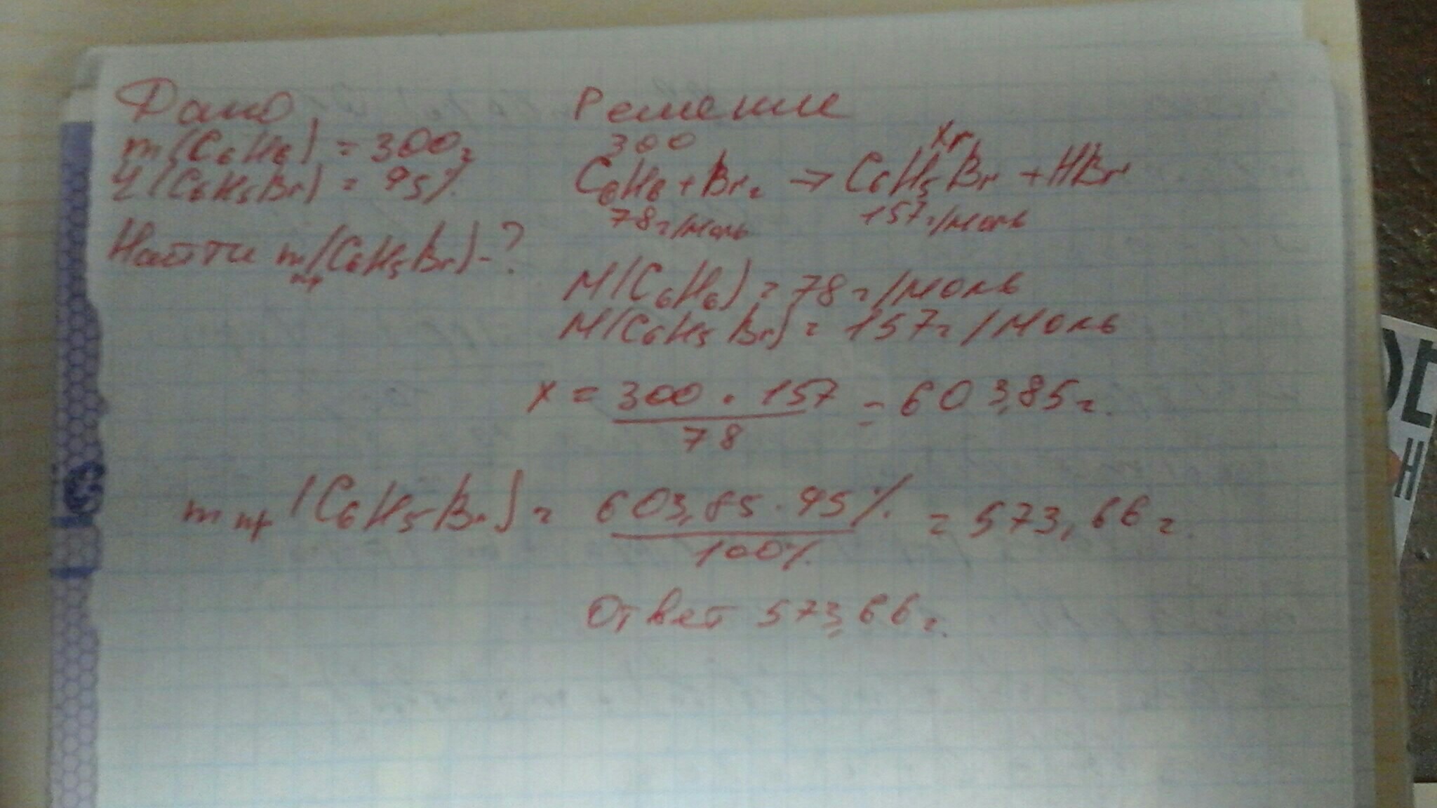 вычислите массу бромбензола который выделится при бромированиивычислите массу бромбензола который выделится при бромировании бензола массой 300г если выход реакции 95%