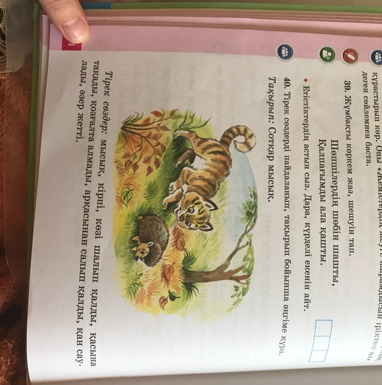 Күздің бір күнінде Арманның сары ала мысығы үйден шығып бақты аралап жүреді. Бір мезетте ағаш түбінде жүрген кірпіні көзіп шалып қалады. Мысық аңдап кірпінің қасына тақады. Бұны сезіп қалған кірпі дәл сол мезетте денесін жасырып, инелерін шығарып домаланып жатып алды. Мысық оны қозғалта алмады. Ақыр соңында кірпінің арқасынан тырнақтарымен салып қалып еді, қан саулай жөнелді. Мысық жан ұшыра мияулап үйге әзер жеткен еді. Ал кірпі болса мысықтан құтылғанына қуанып тіршілігін жалғастыра берді.
