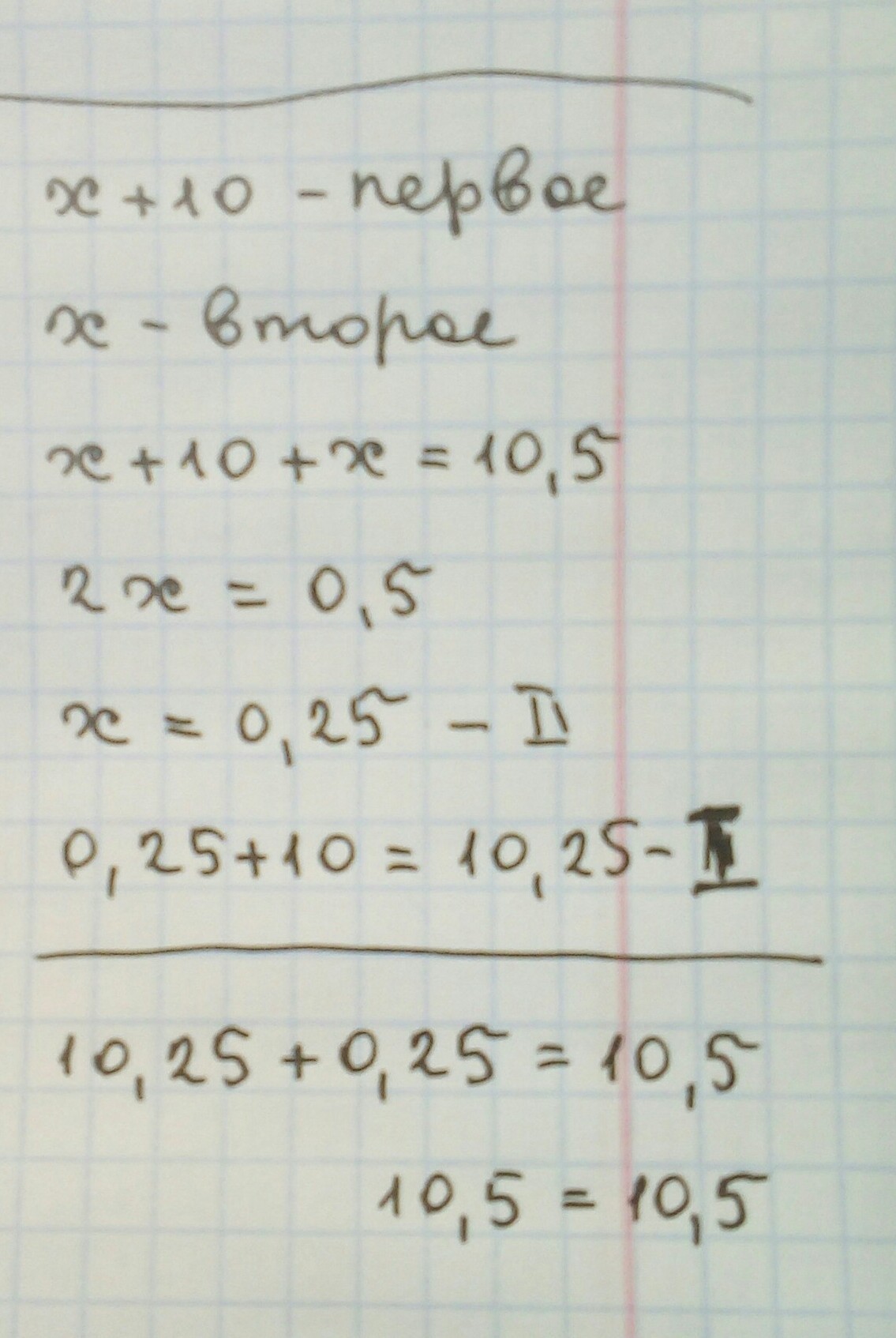 Срочно реши уравнением ! Первое число больше второгона 10.Найдите эти числа,если значения суммы чисел равно 10,5.
