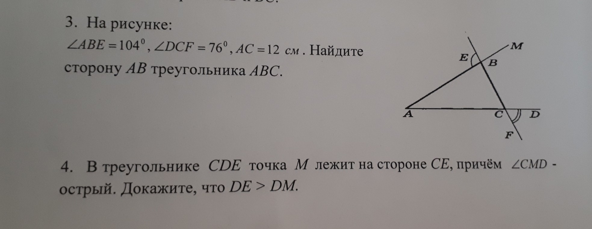 3) найдём угол АВС: угол АВС и угол АВЕ смежные, значит угол АВС=180-104=76. найдём угол ACB: угол АСВ=углу DCF(т.к. они вертикальные) из этого следует, что треугольник АВС- равнобедренный (т.к. углы при основании равны (76 градусов) значит, стороны АВ И АF равны 12 см.