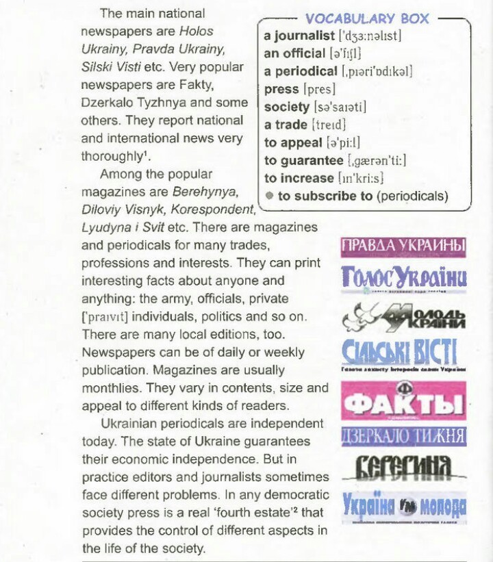 1. КАКИЕ ГАЗЕТЫ И ЖУРНАЛЫ, ЧТО ПРОЧИТАЙТЕ В УКРАИНЕ Миллионы людей во всем мире читают газеты и журналы. Они играют важную роль в жизни любой нации. Среди первых газет в Украине были Львовский курьер (начатый в 1749 году) и «Харьковский еженедельник» (начался в 1817 году). Поскольку Украина стала независимым государством, доля газет и журналов на украинском языке увеличилась. В Украине опубликовано более 3000 газет, а также 1500 журналов.