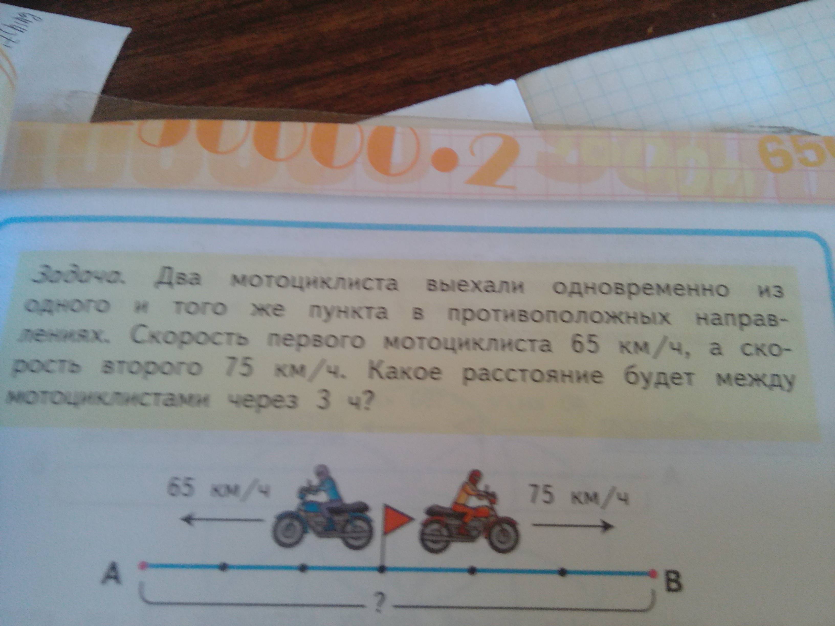 Ответ: Через 3 часа между мотоциклистами будет расстояние 420 километров.