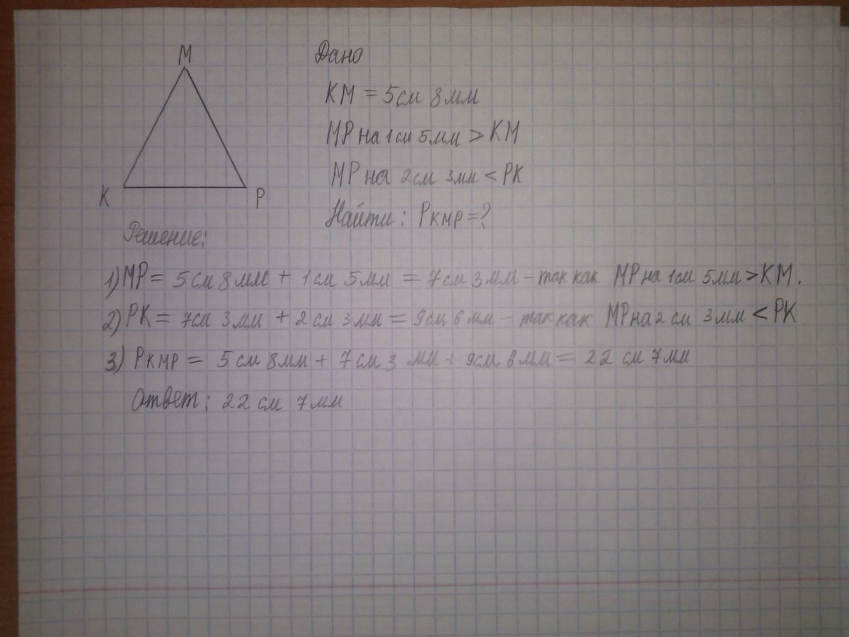 найдите периметр треугольника КМР, если длинна стороны КМ ровна 5см. 8мм., сторона МР на 1см 5 мм длиннее стороны КМ но короче на 2 см. 3 мм. стороны РК