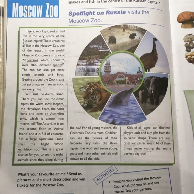 тигры обезьян змей и рыбы в центре российской столицы!эти существа живут в московский зоопарк, один из крупнейших в мире московского зоопарка, занимает площадь в 20 га, где проживает более 7 тысяч различных видов в зоопарк также много экзотических животных и птиц, обойти зоопарк легко, но взял карту, чтобы убедиться, что вы все видитепервый визит животное остров, там вы увидите амурских тигров белого снежного барса гималайских медведей, львов и даже в азии австралийского евс, который почти два метра аквариум находится на втором этаже животного остров, и это заполнит разноцветные рыбы в больших аквариумов не пропустите ночь всемирной выставки тоже это большой шанс увидеть ночь животных, поскольку они спят днем для всех молодых посетителей детского зоопарка должен детей могут увидеть героев любимых сказок: трех поросят, волк и семь молодых коз и многих других от души животных известные всем детям.дети всех возрастов могут также посетить площадки и BYU подарки из сувенирных лавок также есть кафе и зонами для пикника все od эта вещь сделайте посещение зоопарка идеальный день.