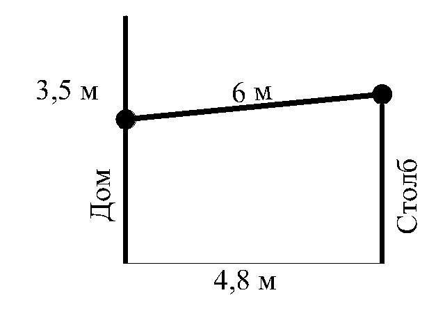 От столба к дому натянут провод длиной 6м, который закреплён на стене дома на высоте 3,5 м от земли. Вычислите высоту столба, если расстояние от дома до столба равно 4,8м. Ответ дайте в метрах.