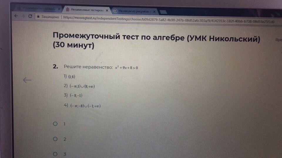 здесь тоже решаем методом интервалов, где + - +, данное неравенство больше 0, значит выбираем крайние интервалы, значит, правильный ответ 4