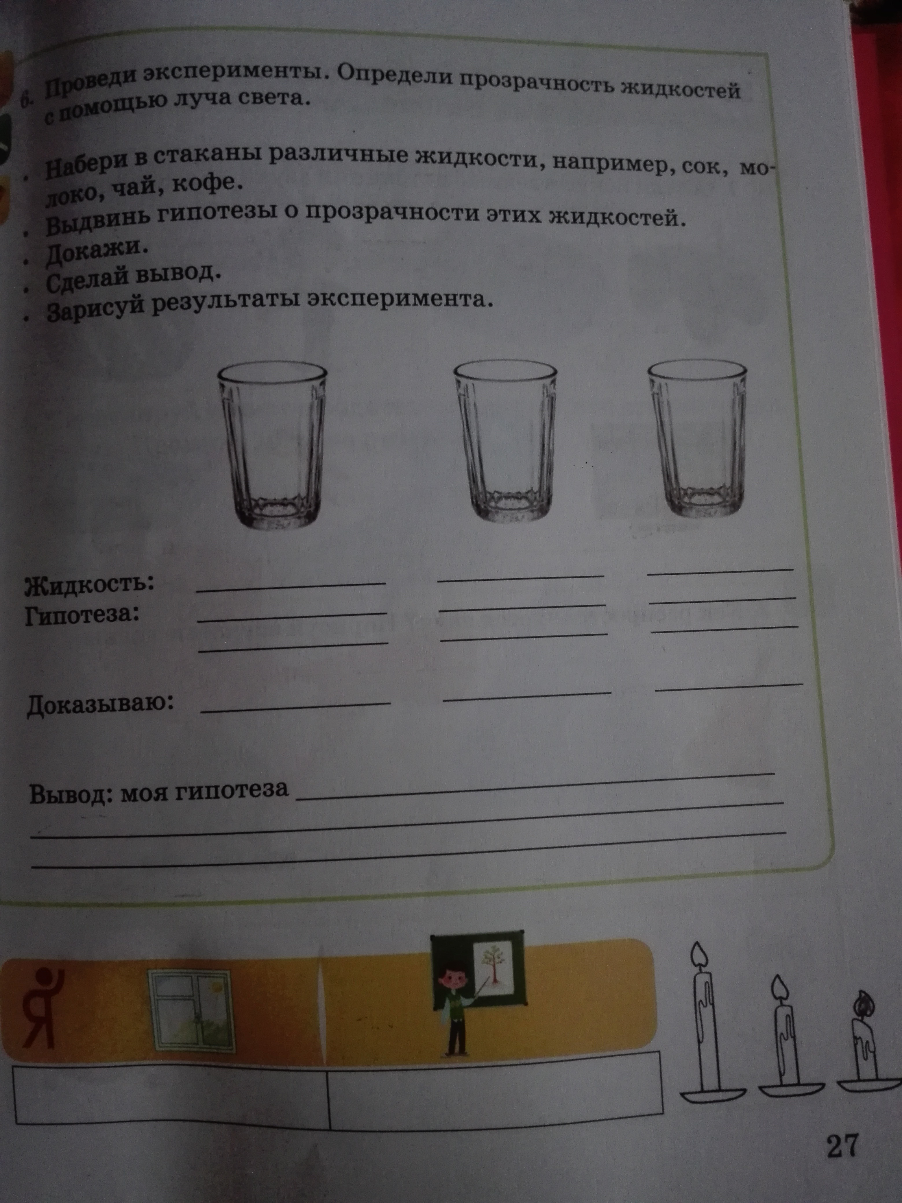 Жидкость:Вода. Гипотеза:Вода прозрачная.Док-ва:Через воду можно увидеть что-то или кого-то