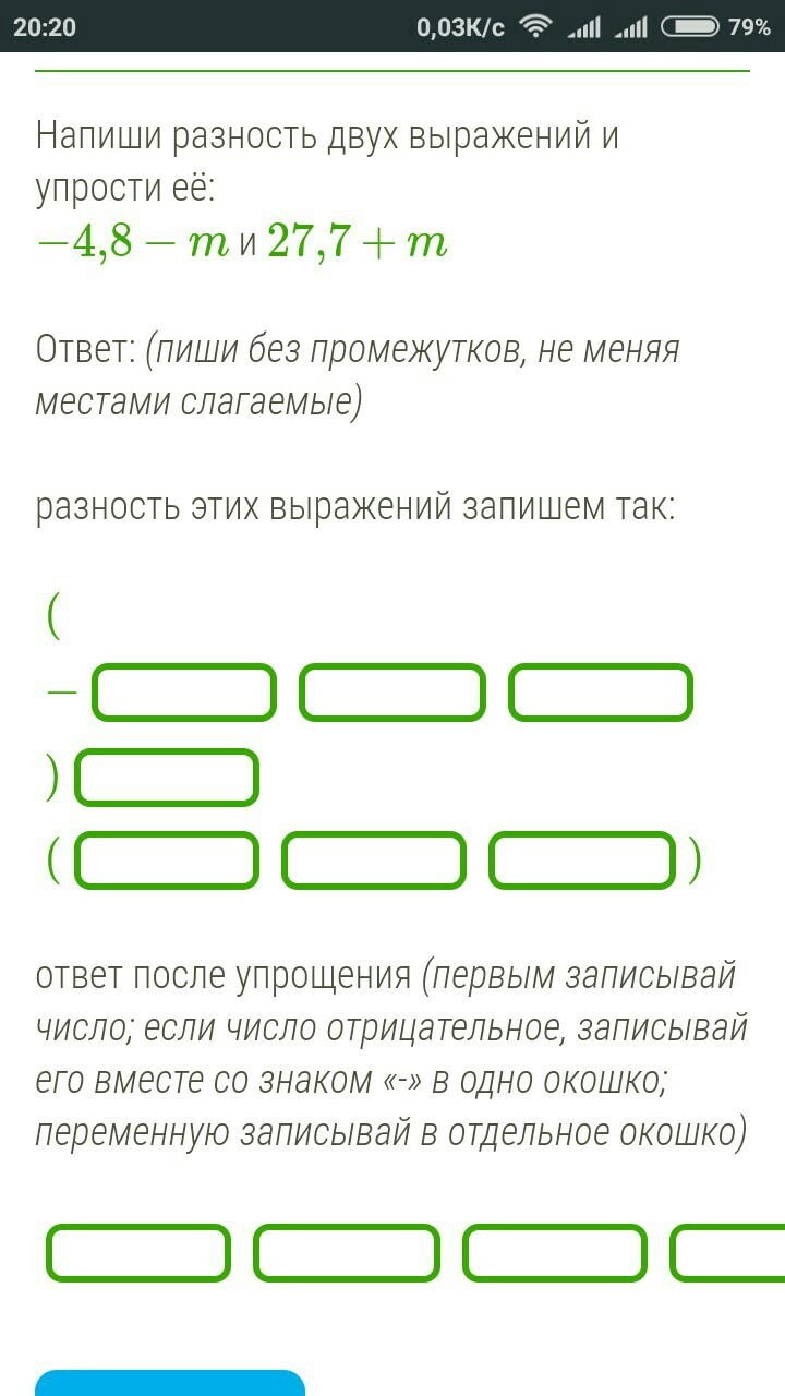 ( в первое окошко введи числовое слагаемое, во второе окошко — соответствующий знак, в третье — впиши числовой коэффициент, а в четвёртое — переменную; при вводе переменной используй латинскую раскладку)