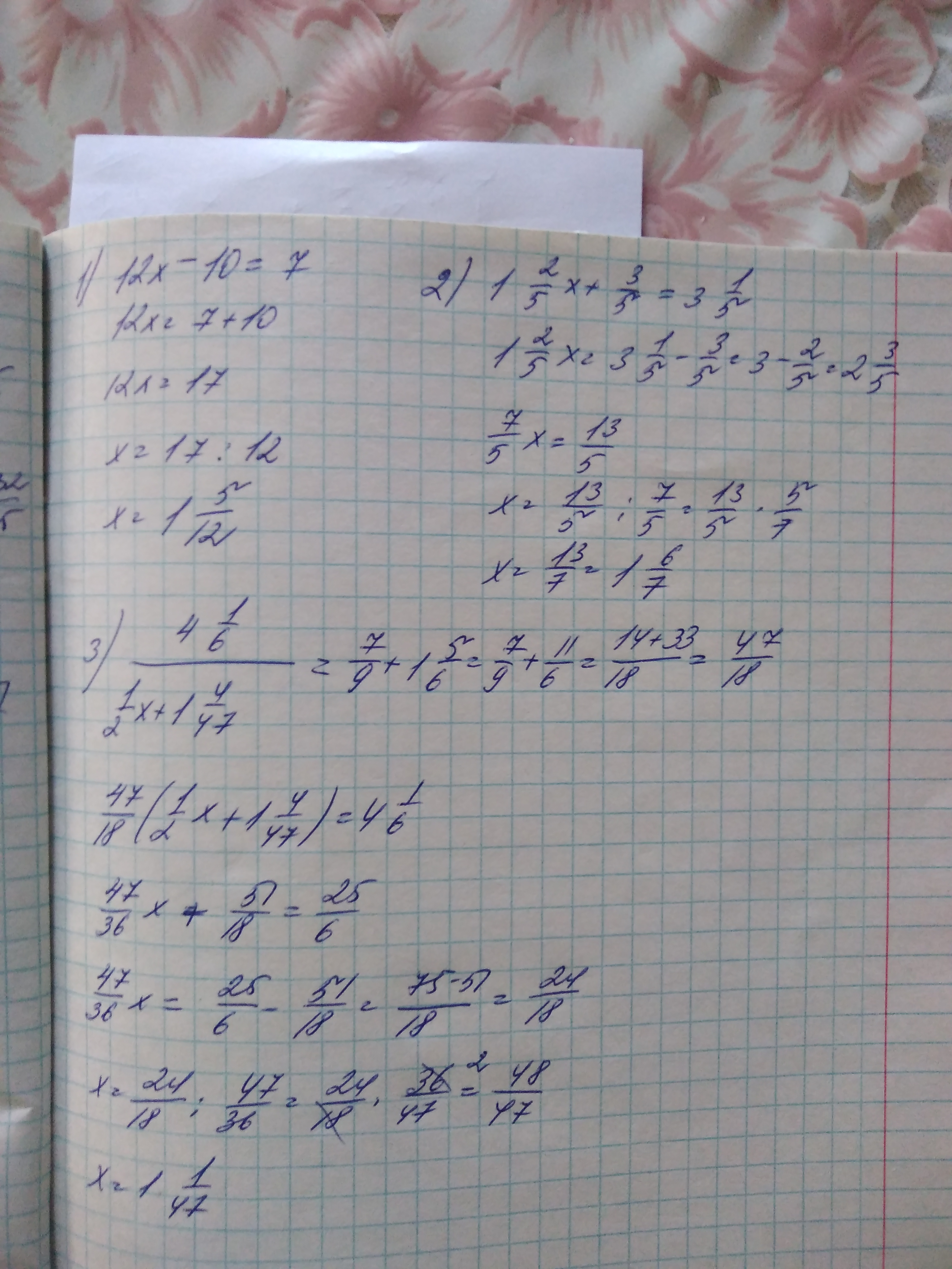 решите уравнения с дробями 1) (4/5*х-2/3)*15=7 2) 2целых2/3*(2/5*х+3/5+х)=3цел1/5 3)4целых1/6:(1/2х+1цел4/47)-1цел5/6=7/9