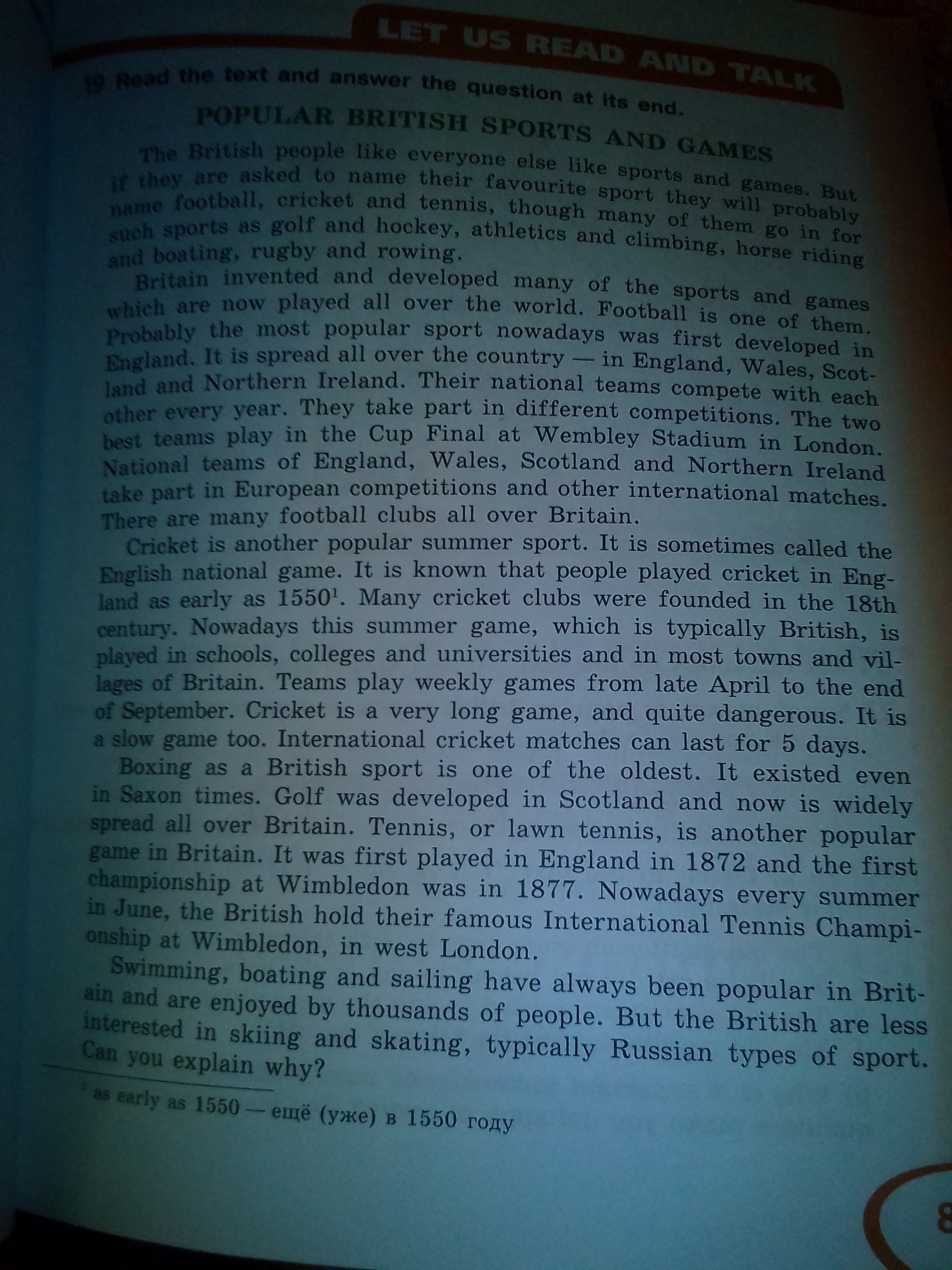 Британский народ любят различные спортивные состязания и игры . Великобритания придумал и разработал многие из видов спорта и игр , которые сейчас играют во всем мире . Футбол является одним из них . Она распространяется по всей стране - в Англии , Уэльсе, Шотландии и Северной Ирландии . Их национальные команды соревнуются друг с другом каждый год. Они принимают участие в различных конкурсах . Две лучшие команды играют в финале Кубка в коловорот стадионе в Лондоне. Есть много футбольных клубов по всему Великобритании.Британцы славятся своим чувством юмора . Вот один из их шуток о футболе : " Футбол это игра, в которой одна сторона стадиона хотят видеть одиннадцать человек убитыми . "Крикет является еще одним популярным летний спортивный . Его иногда называютанглийской национальной игрой . Известно, что люди играли в крикет в Англии еще в 1550 году. В настоящее время этим летом игра играет в школах, колледжах , университетах и в большинстве городов и сел Великобритании. Студенты играют еженедельные игры с конца апреля до конца сентября . Международный крикет последних матчах в течение пяти дней . Крикет не играет только мужчины , девушки и женщины играть в эту игру тоже.Бокс - это один из старейших игры. Она существовала даже в саксонских времен . Гольф стал развивается в Шотландии и в настоящее время широко распространены по всей Великобритании . В настоящее время каждое лето в июне , британцы провести знаменитый Международный чемпионат Теннис на Уимблдоне под Лондоном .Плавание, катание на лодках, парусный спорт, регби, хоккей , гребля , легкая атлетика , скалолазание и верховая езда всегда были популярны в Великобритании и пользуются миллионы людей .