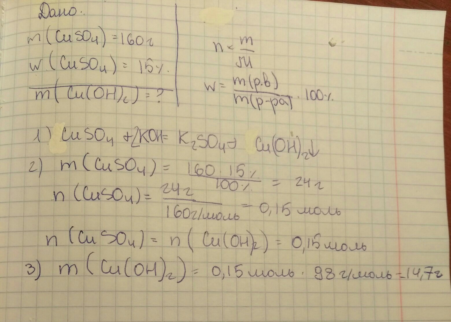 Сколько граммов осадка образуется при взаимодействии 160г 15% раствора сульфата меди с необходимым количеством гидроксид КАЛИЯ?