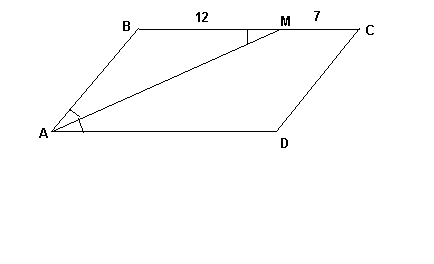Дано: параллелограмм ABCD, АМ - биссектриса угла А ВМ=12см, МС=7см