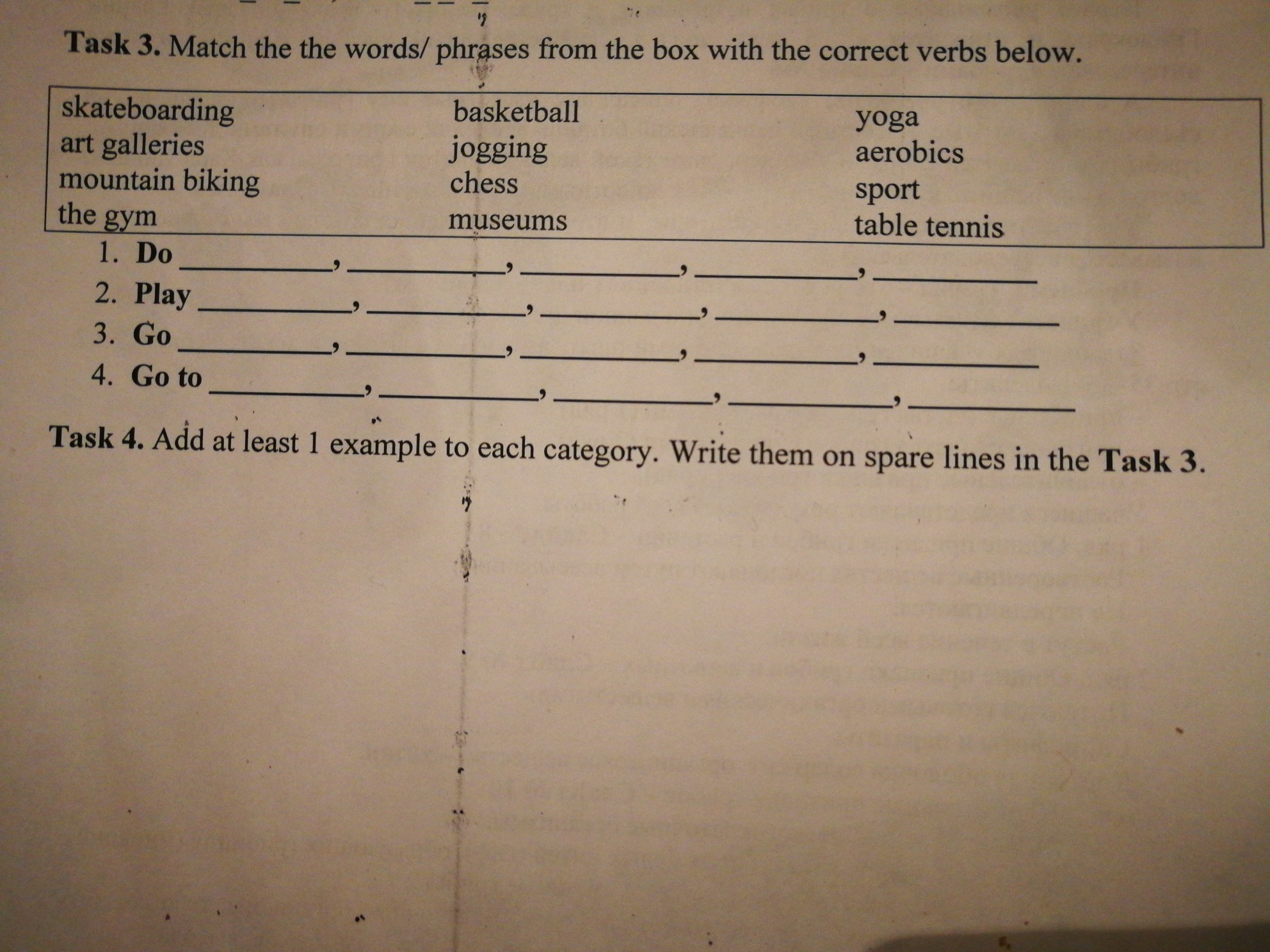 1. yoga, aerobics, sport, art galleries.