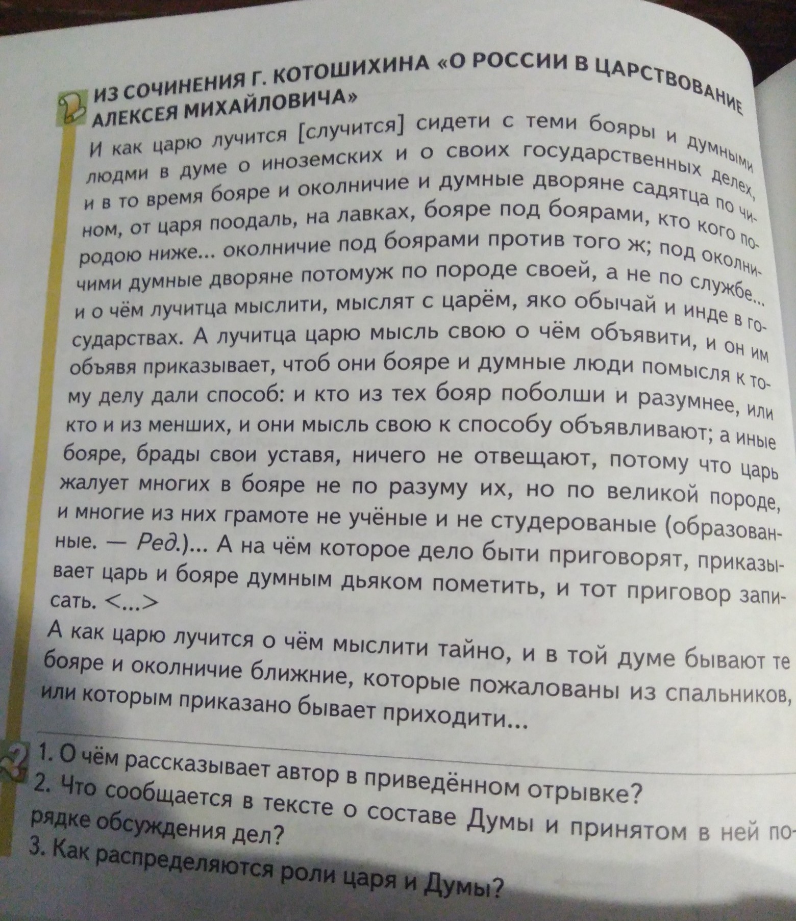 1. Здесь рассказывается о том, что во время Думы царь, бояре и дворяне говорили о том, как царь даёт обычным людям чины не по уму. И некоторые из бояр не очень грамотны.