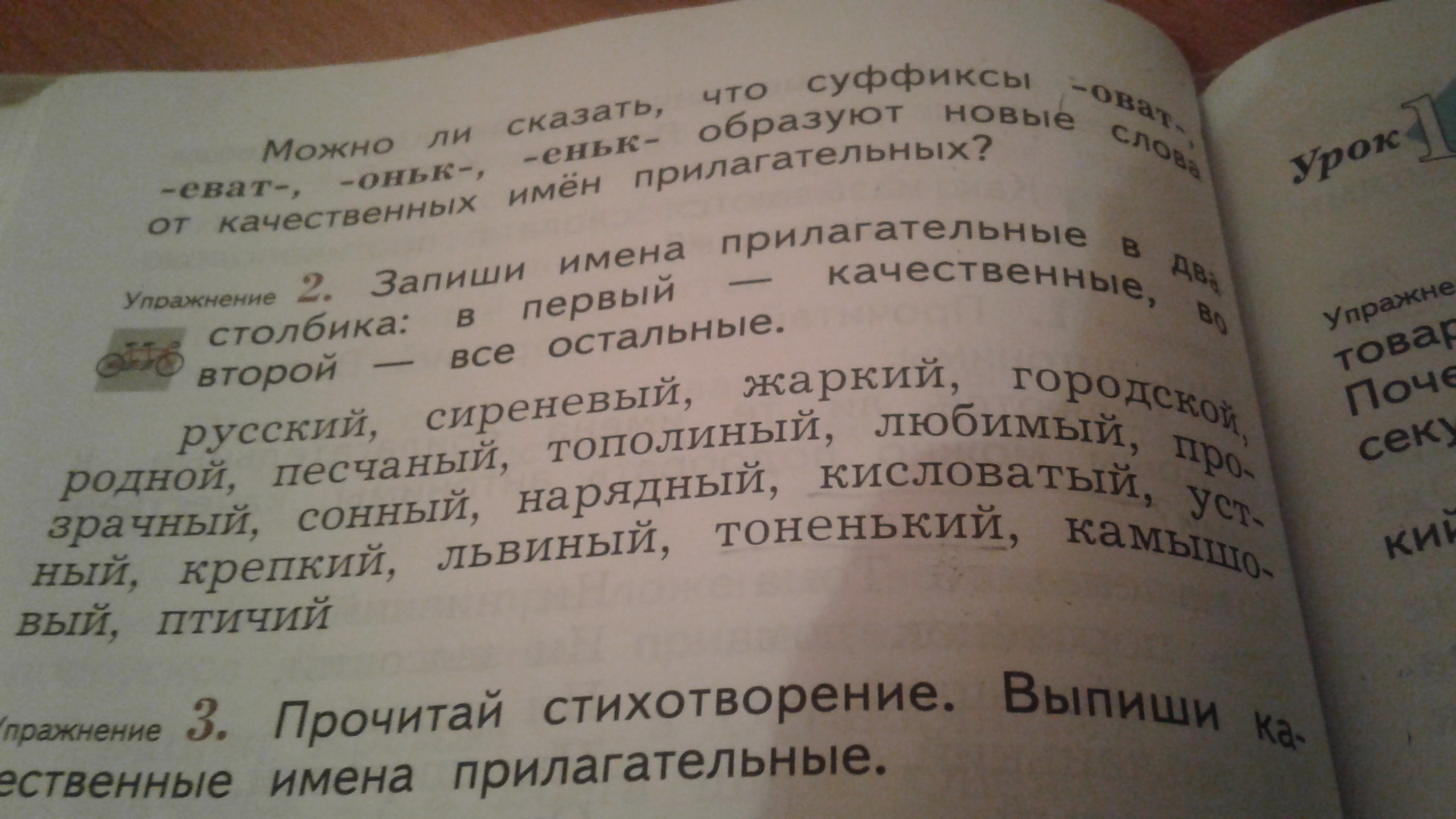 Запиши имена прилагательные в два столбика: в первый -- качественные, во второй -- все остальные
