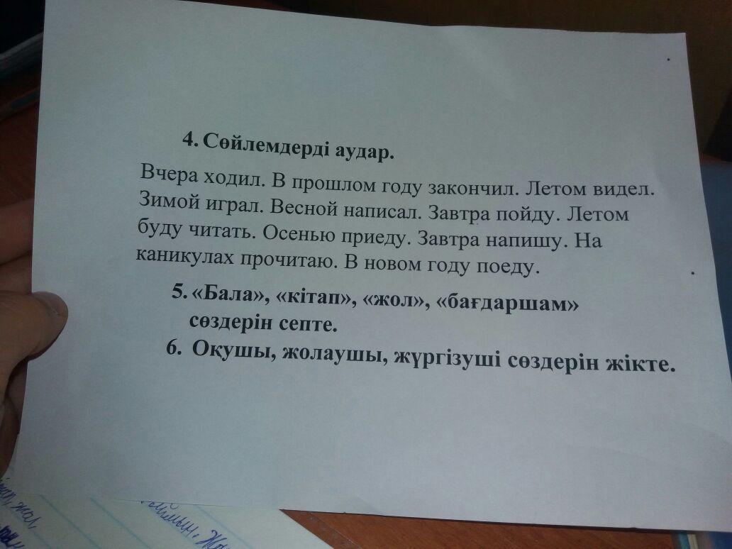 Кеше бардым. Өткен жылы бітірдім. Жазда көрдім. Қыста ойнадым. Көктемде жаздым. Ертең барамын. Жазда оқимын. Күзде келемін. Ертең жазамын. Каникулда оқимын. Жаңа жылда барамын