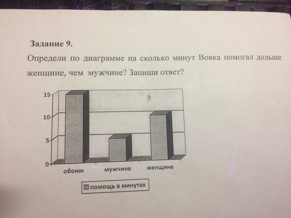 Задание 9. Определи по диаграмме на сколько минут Вовка помогал дольше женщине, чем мужчине? Запиши ответ? К заданию 9 прилагается данный чертёж.