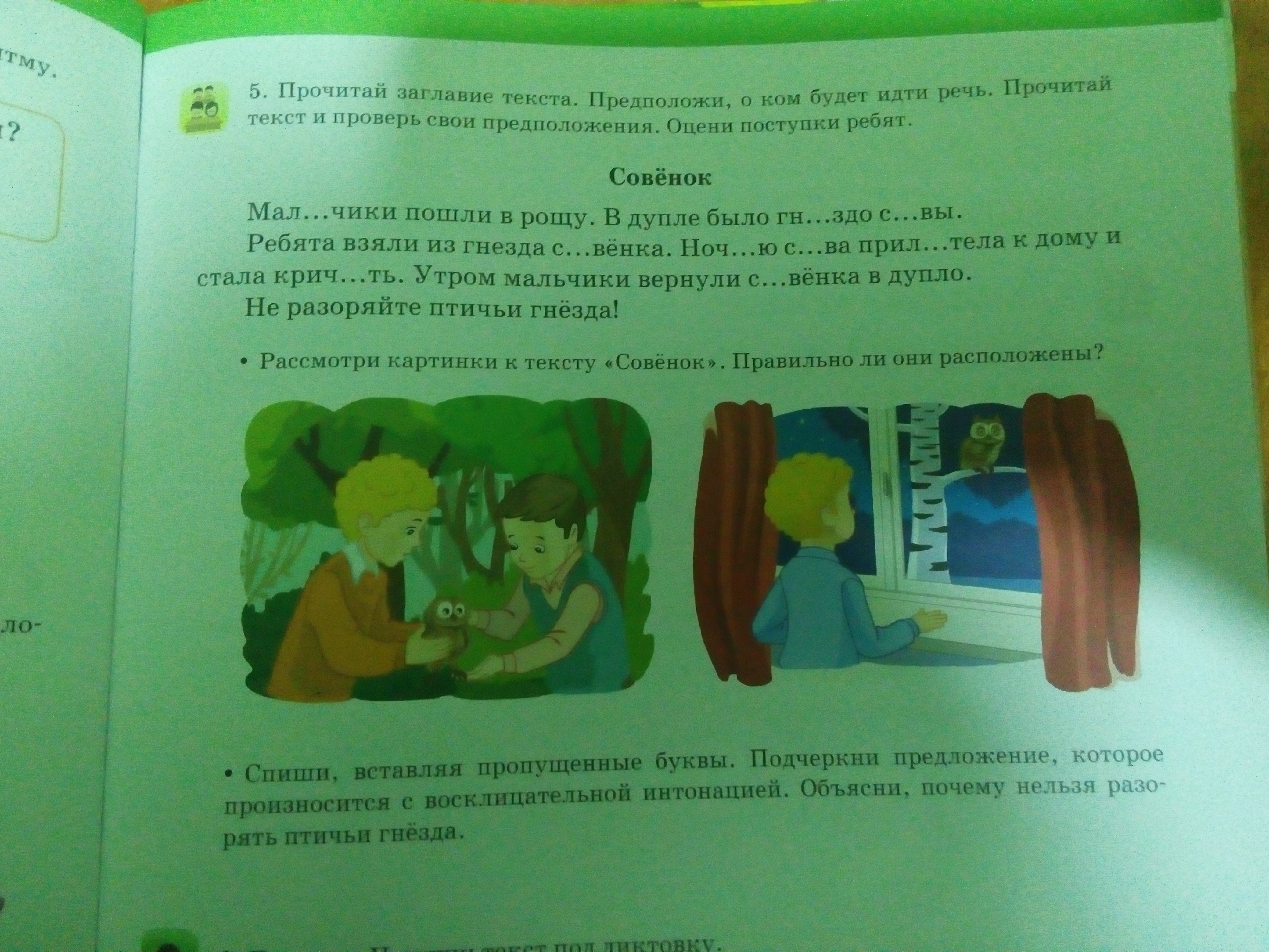 Мальчики пошли в рощу. В дупле было гнездо совы. Ребята взяли из гнезда совёнка. Ночью сова прилетела к дому и стала кричать. Утром мальчики вернули совёнка в дупло. Не разоряйте птичьи гнёзда!