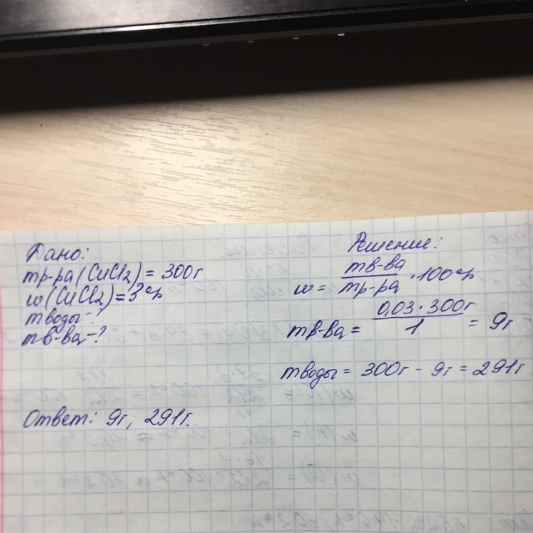 сколько граммов соли и воды потребуется для приготовления 300 г расстворителя в котором массовая доля CuCl2=3 %