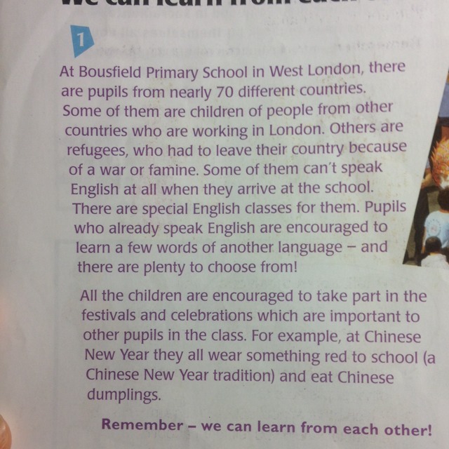 В начальной школе Bousfield на западе Лондоне, учатся ученики примерно из 70 различных стран. Некоторые из них дети людей из других стран, которые работают в Лондоне. Другие это эмигранты, которым пришлось покинуть страну из-за войны или голода. Некоторые из них вообще не могут говорить по-английски, когда приезжают в школу. Здесь есть специальные классы английского для них. Ученики, которые уже говорят по-английски очень хотят узнать новые слова другого языка- и им есть из чего выбирать!