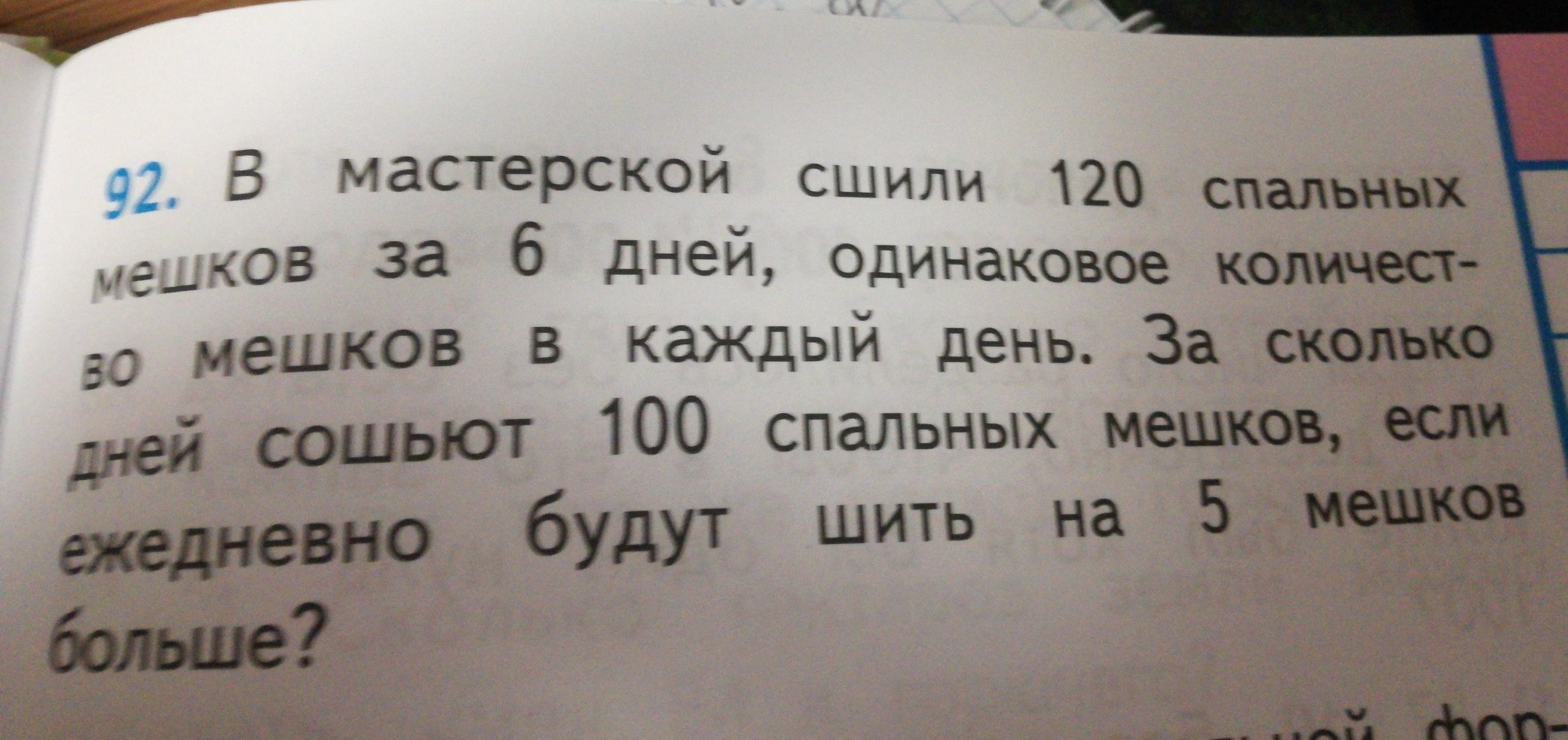 1)120:6=20(сп.м)-шили в один день 2)20+5=25(сп.м)-начали шить больше в один день 3)100:25=4(д)-шили 100спальных мешков