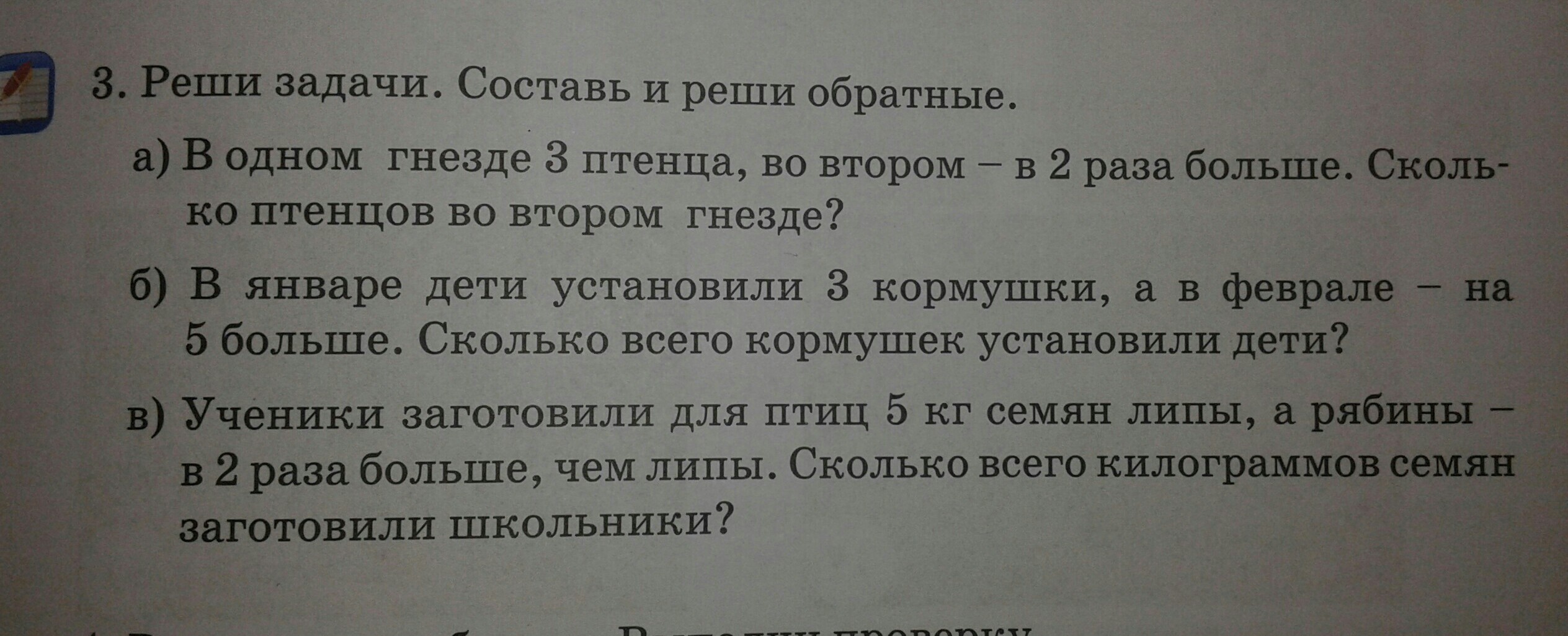 1. 3*2=6 (птенцов) ответ: 6 птенцов 2. 3+5=8( кормушек) ответ: 8 кормушек. 3 5*2=10(кг) ответ: 10кг