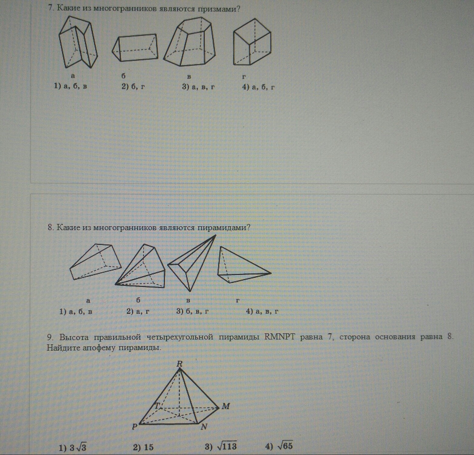8. 3 (пирамида это произвольная фигура в основании и исходящие из нее линии, которые сходятся в одну точку, вариант а не подходит)