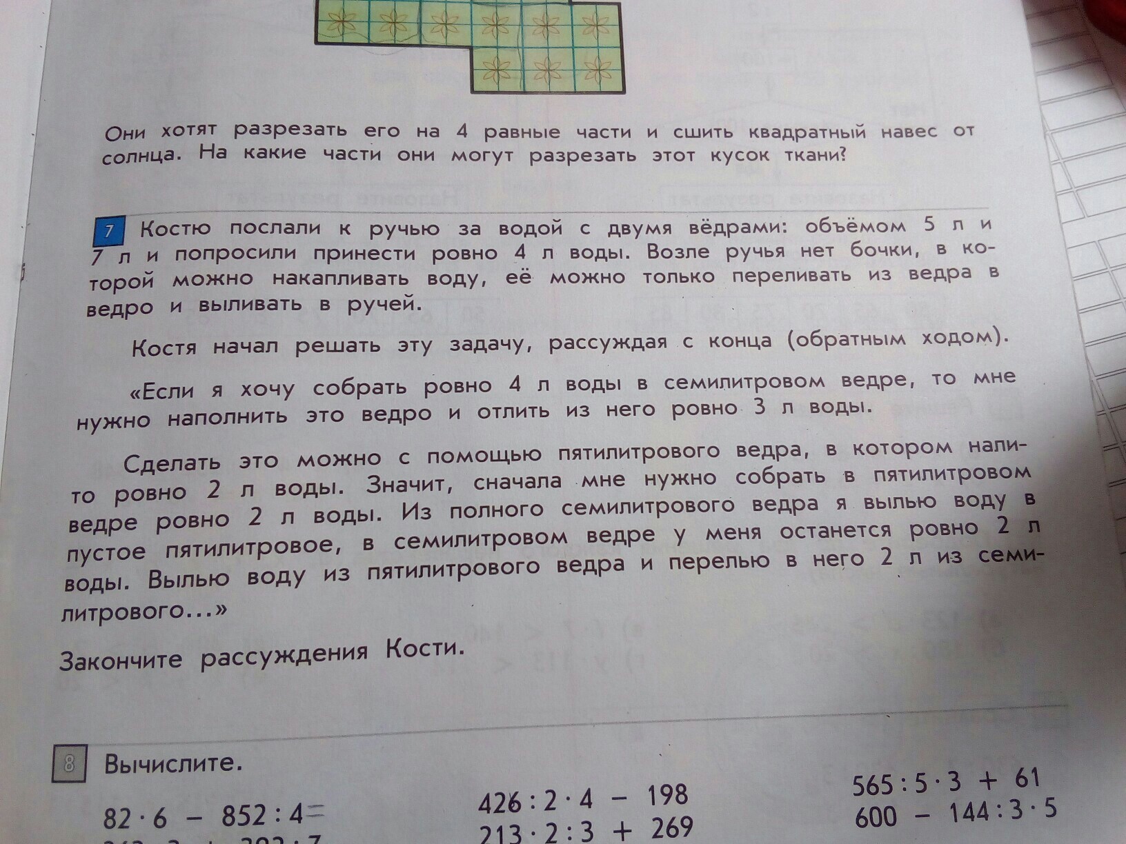 ... семилитрового ведра. Налью 7-вое ведро. И вылью в пятилитровое 3 литра, где у меня уже есть 2 литра. В 7-вом ведре останется 4 литра.