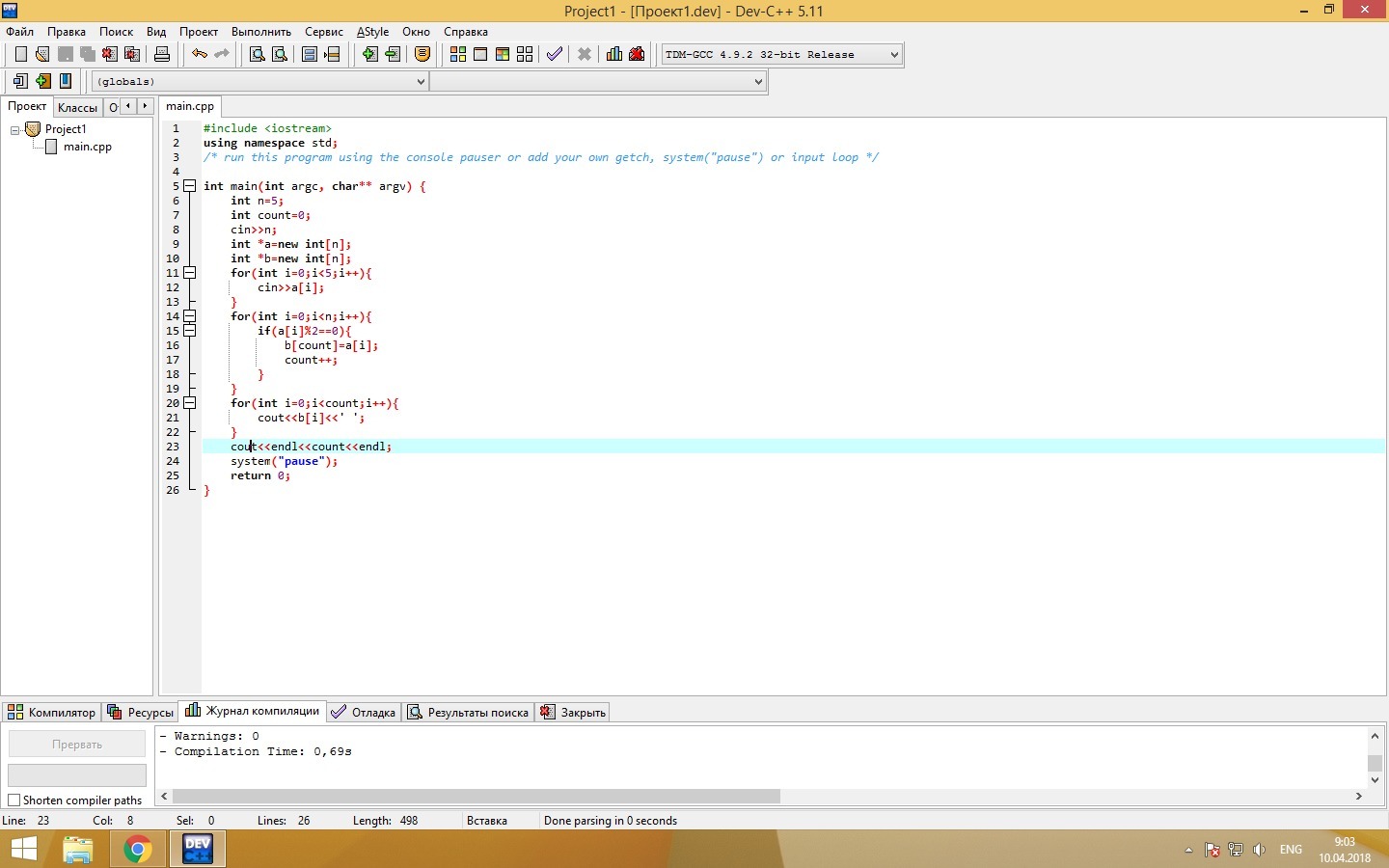 дан целочисленный массив a размера n. Переписать в новый целочисленный массив В все четные числа из исходного массива (в том же порядке) и вывести размер массива В и его содержание (С++)