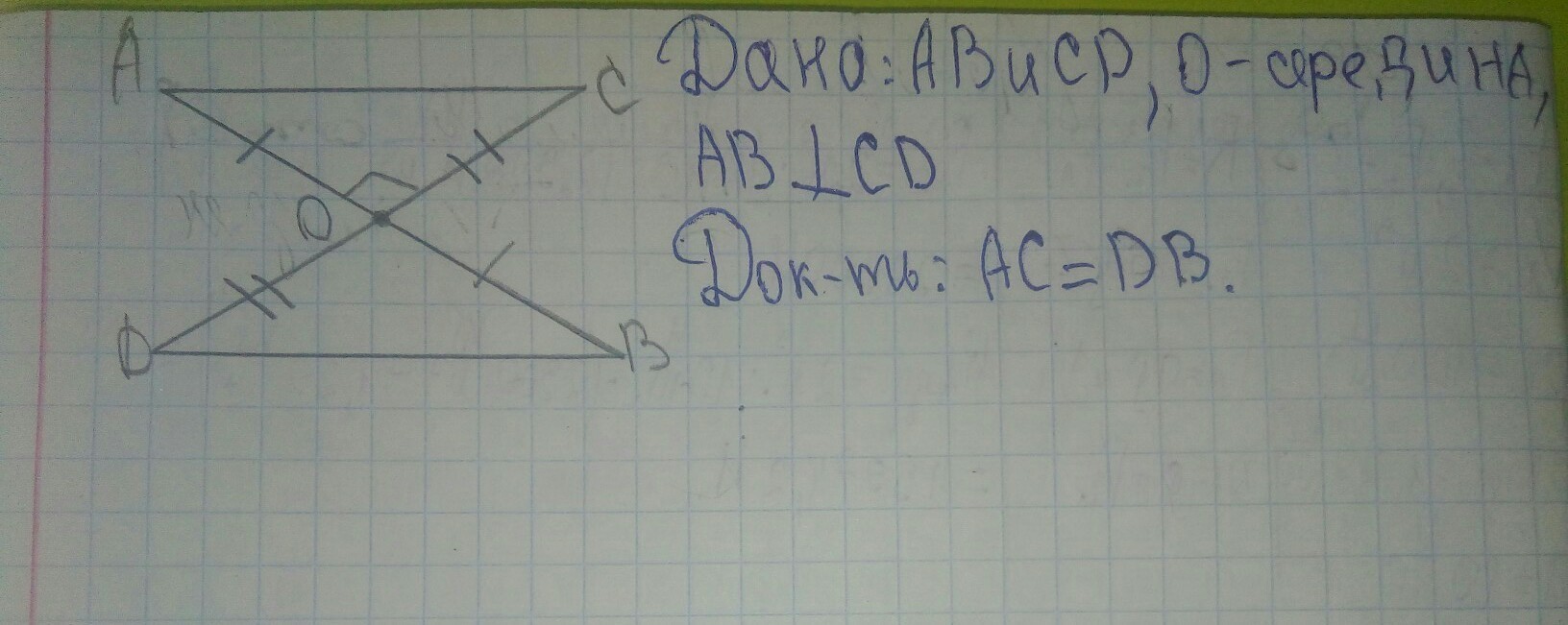 Диагонали AB и CD четырехугольника ACBD точкой пересечения делятся пополам, следовательно ACBD - параллелограмм. AC и DB равны как противоположные стороны параллелограмма.