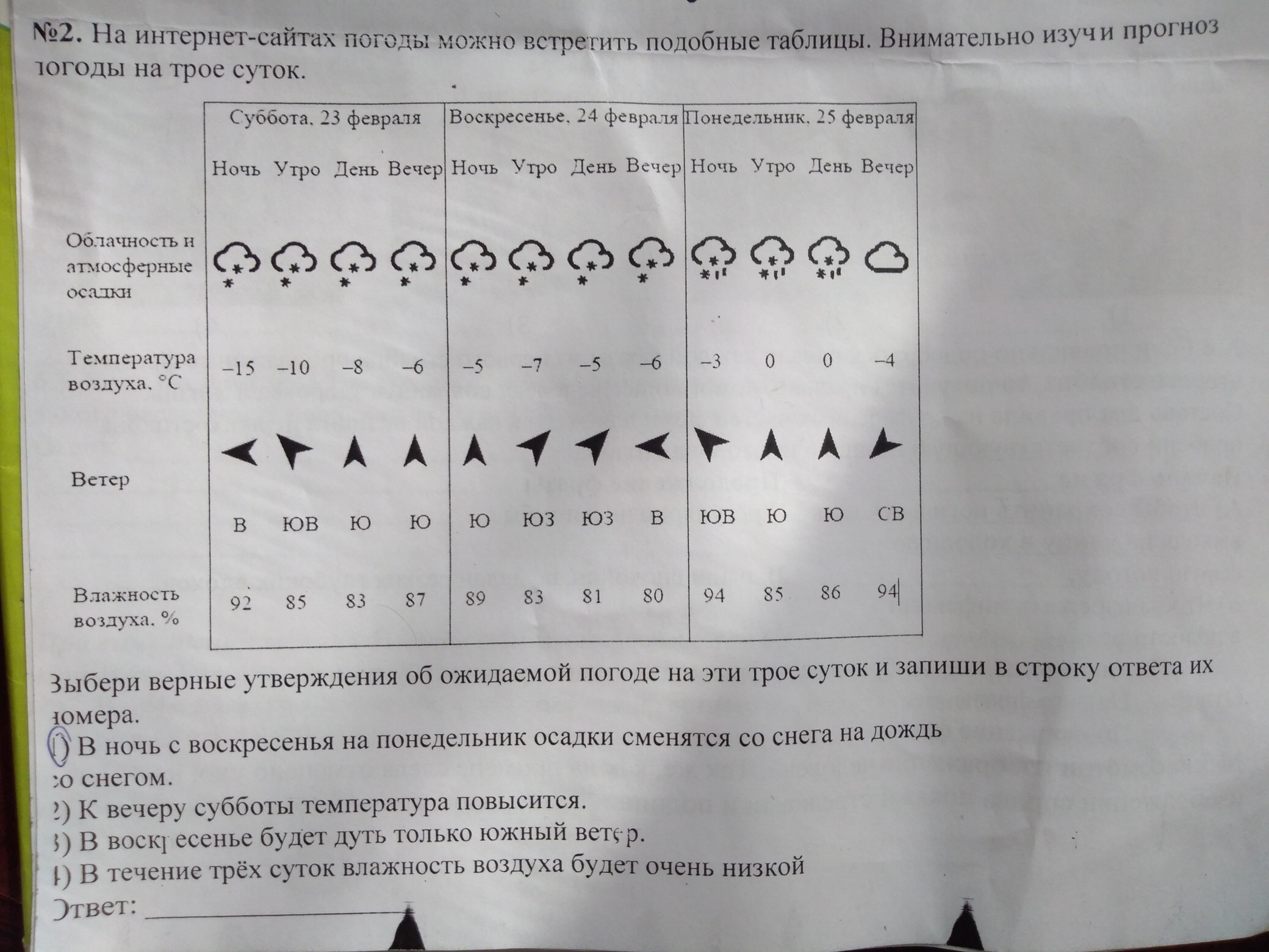 Выбери верные утверждения об ожидаемой погоде на эти трое суток и запиши в строку ответа их номера. Пожалуйста помогите заранее спасибо! Окружающий мир